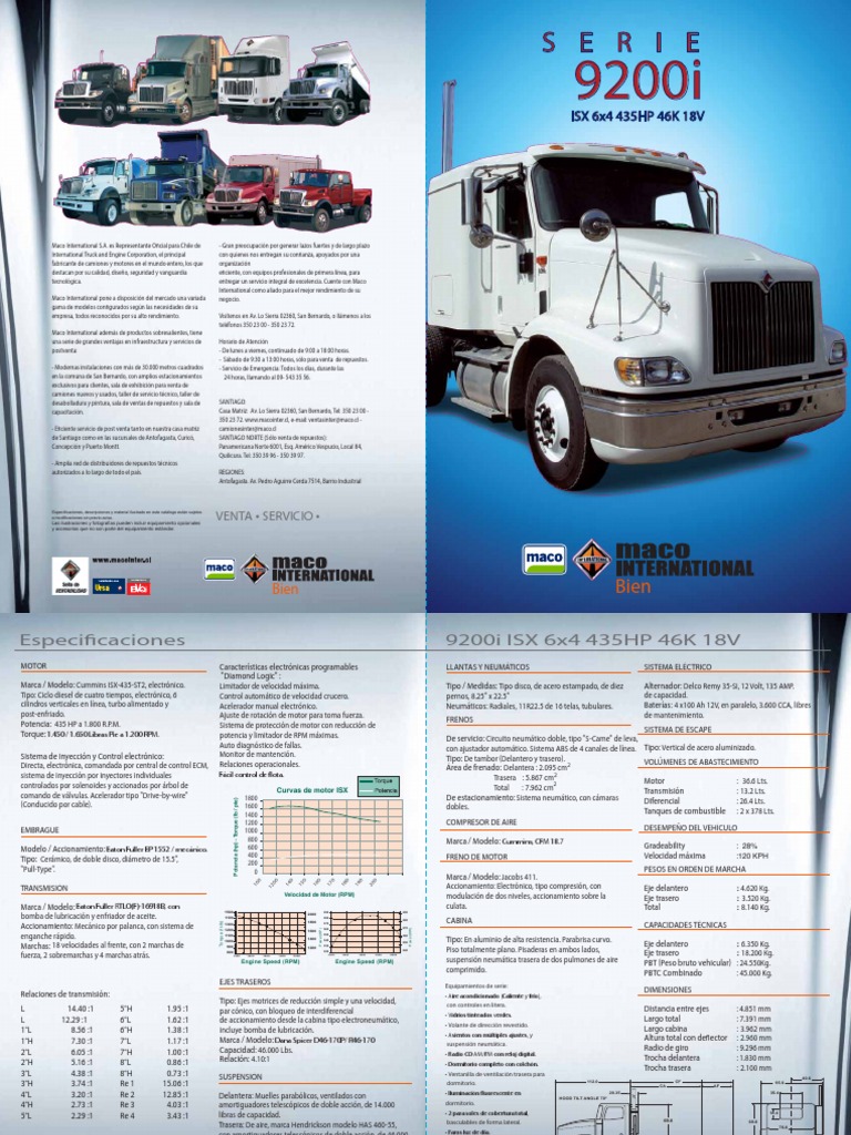 Maco International S.A. es Representante O cial para Chile de International Truck and Engine Corporation, el principal fabricante de camiones y motores en el mundo entero, los que destacan por su calidad, diseo, seguridad y vanguardia tecnolgica. Maco International pone a disposicin del mercado una variada gama de modelos con gurados segn las necesidades de su empresa, todos reconocidos por su alto rendimiento. Maco International adems de productos sobresalientes, tiene una serie de grandes ventajas en infraestructura y servicios de postventa: - Modernas instalaciones con ms de 30.000 metros cuadrados en la comuna de San Bernardo, con amplios estacionamientos exclusivos para clientes, sala de exhibicin para venta de camiones nuevos y usados, taller de servicio tcnico, taller de desabolladura y pintura, sala de ventas de repuestos y sala de capacitacin. - E ciente servicio de post venta tanto en nuestra casa matriz de Santiago como en las sucursales de Antofagasta, Curic, Concepcin y Puerto Montt. - Amplia red de distribuidores de repuestos tcnicos autorizados a lo largo de todo el pas.