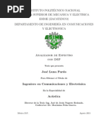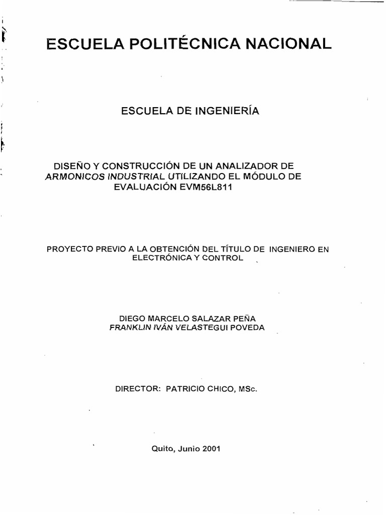 especializado para el anlisis de seales, denominado DSP. En la actualidad este componente se ha convertido en la parte fundamental para la construccin de este tipo de analizadores, en vista de las caractersticas que este presenta para el anlisis de seales. El analizador que se propone en este trabajo est constituido por un sistema de adquisicin de datos que incluye un conversor anlogo digital, una interface de acondicionamiento de la seal, y un mdulo de evaluacin DSP56L811EVM de Motorola, el cual realiza el proceso de control del conversor anlogo digital, tratamiento de la seal digitalizada usando la transformada rpida de Fourier (FFT), y transmisin de resultados hacia la computadora. Estos resultados son presentados mediante el uso de un programa computacional elaborado en Visual Basic. Este analizador puede ser utilizado para medir los 30 primeros armnicos de una seal elctrica que tenga una frecuencia fundamental de 60Hz, si se analiza una seal elctrica con una frecuencia fundamental diferente, el analizador no funcionara adecuadamente. Este proyecto presenta un procedimiento sencillo en el cual se puede comprender e identificar los procesos utilizados para la deteccin de armnicos de una seal elctrica de 60Hz.
