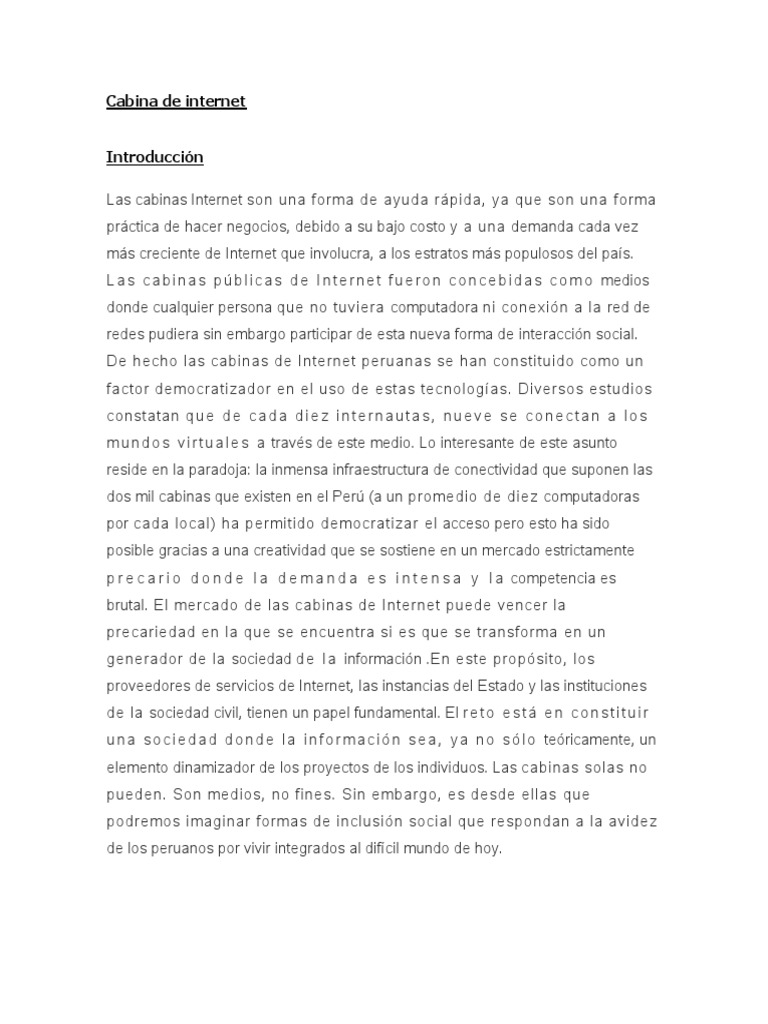 prctica de hacer negocios, debido a su bajo costo y a una demanda cada vez ms creciente de Internet que involucra, a los estratos ms populosos del pas. L a s c a b i n a s p b l i c a s d e I n t e r n e t f u e r o n c o n c e b i d a s c o m o medios donde cualquier persona que no tuviera computadora ni conexin a la red de redes pudiera sin embargo participar de esta nueva forma de interaccin social. De hecho las cabinas de Internet peruanas se han constituido como un factor democratizador en el uso de estas tecnologas. Diversos estudios constatan q u e d e c a d a d i e z i n t e r n a u t a s , n u e v e s e c o n e c t a n a l o s m u n d o s v i r t u a l e s a travs de este medio. Lo interesante de este asunto reside en la paradoja: la inmensa infraestructura de conectividad que suponen las dos mil cabinas que existen en el Per (a un promedio de diez computadoras por cada local) ha permitido democratizar el acceso pero esto ha sido posible gracias a una creatividad que se sostiene en un mercado estrictamente p r e c a r i o d o n d e l a d e m a n d a e s i n t e n s a y l a competencia es brutal. El mercado de las cabinas de Internet puede vencer la precariedad en la que se encuentra si es que se transforma en un generador de la sociedad d e l a informacin .En este propsito, los proveedores de servicios de Internet, las instancias del Estado y las instituciones de la sociedad civil, tienen un papel fundamental. El r e t o e s t e n c o n s t i t u i r u n a s o c i e d a d d o n d e l a i n f o r m a c i n s e a , y a n o s l o tericamente, un elemento dinamizador de los proyectos de los individuos. Las cabinas solas no pueden. Son medios, no fines. Sin embargo, es desde ellas que podremos imaginar formas de inclusin social que respondan a la avidez de los peruanos por vivir integrados al difcil mundo de hoy.