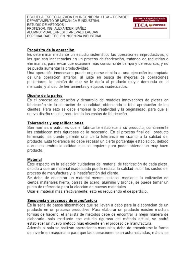 Propsito de la operacin Es determinar mediante un estudio sistemtico las operaciones improductivas, o las que son innecesarias en un proceso de fabricacin, tratando de reducirlas o eliminarlas, para evitar que ocasione ms consumo de tiempo y de recursos, y no se pueda aumentar la productividad. Una operacin innecesaria puede originarse debido a: una ejecucin inapropiada de una operacin anterior, al juste en busca de mejoras de operaciones posteriores, la opinin de que se le dara al producto mayor demanda en el mercado, y al uso de herramientas y equipos inadecuados. Diseo de la partes Es el proceso de creacin y desarrollo de modelos innovadores de piezas en fabricacin sin la alteracin de su calidad, obteniendo la total aprobacin de los clientes. Para esto se debe emplear la creatividad y la originalidad, para que el nuevo diseo resalte, reduciendo los costos de fabricacin. Tolerancias y especificaciones Son normas o patrones que el fabricante establece a su producto, comnmente las establecen ms rigurosas de lo necesario. En el proceso final del producto terminado, se puede permitir una cierta tolerancia en cuanto a la calidad del producto. Esta tolerancia no debe rebasar un cierto porcentaje establecido, debido a que no tendra la calidad que se requiere para poder obtener un muy buen producto. Material Este aspecto es la seleccin cuidadosa del material de fabricacin de cada pieza, debido a que un material inadecuado puede reducir la calidad, subir los costos del proceso de manufactura y la insatisfaccin del cliente. Se debe de encontrar un material menos costoso: mediante la cotizacin de ciertos materiales hierro, barras de acero, aluminio y bronce, se puede tomar un punto de referencia para la eleccin de nuevos materiales. Usar el material ms efectivamente: esto es reduciendo el desperdicio. Secuencia y procesos de manufactura Es la serie de pasos sistemticos que se llevan a cabo para la elaboracin de un producto en un proceso productivo. Para elaborar un producto existen muchas formas de hacerlo, el analista de mtodos debe de encontrar la mejor manera de elaborarlo, solo mediante ese estudio riguroso del mtodo actual, se podr establecer un nuevo mtodo ms eficiente en el proceso de manufactura. Adems si solo se realizan operaciones manuales, debe de encontrarse la forma de invertir en maquinaria para que las operaciones sean automatizadas, ms si se
