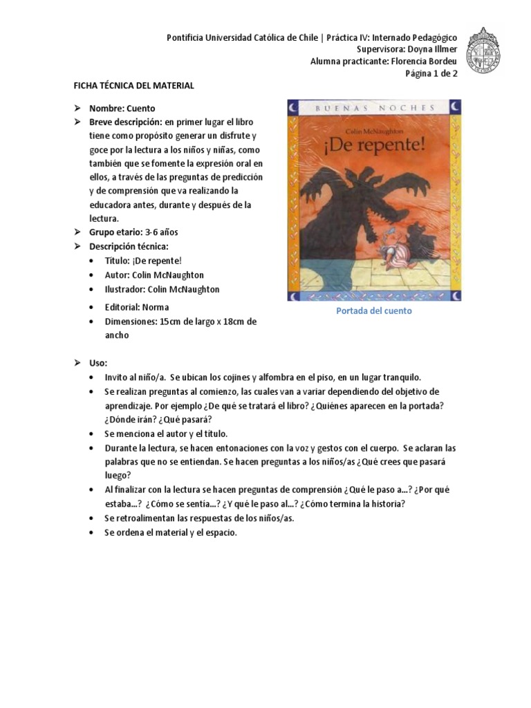 Pgina 1 de 2 FICHA TCNICA DEL MATERIAL Nombre: Cuento Breve descripcin: en primer lugar el libro tiene como propsito generar un disfrute y goce por la lectura a los nios y nias, como tambin que se fomente la expresin oral en ellos, a travs de las preguntas de prediccin y de comprensin que va realizando la educadora antes, durante y despus de la lectura. Grupo etario: 3-6 aos Descripcin tcnica: Ttulo: De repente! Autor: Colin McNaughton Ilustrador: Colin McNaughton Editorial: Norma Dimensiones: 15cm de largo x 18cm de ancho Portada del cuento