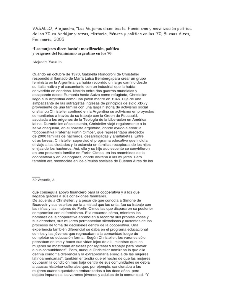 la transformacin de la conciencia planetaria. 5 Entrevista de la autora. Una sabrosa ancdota muestra la transformacin en las ideas y la militancia de Christeller. Al preguntarle en qu medida las prcticas feministas como la concienciacin haban transformado su perspectiva, ella record el momento en que se dio cuenta de que durante todos los aos en que haba sido la mano derecha del Padre Paoli (director de la Orden y motor de las cooperativas), escribiendo sus conferencias y lavando sus medias, l la haba explotado sin ningn reconocimiento a sus contribuciones. Harta de tal situacin, un da abofete al sorprendido Paoli y se rehus a continuar trabajando para l. Incluso cuando aos ms tarde el sacerdote se disculp en una carta y le sugiri que podan seguir trabajando juntos, Christeller se neg y rechaz su ofrecimiento. Entrevista de la autora. 6Si bien establecemos esta distincin, lo hacemos a sabiendas de la existencia de un debate historiogrfico en torno a las continuidades y rupturas existentes entre uno y otro momento histrico. Por otro lado, no nos adentraremos en el anlisis de la etapa que comienza en 1976 puesto que excede el marco temporal de este trabajo. 7 En este sentido, las dos etapas sealadas se diferencian asimismo por los ejes o problemas desde los que se abordan los estudios sobre la larga dcada del 70 en la Argentina: antes de 1976 el anlisis se ha centrado mayoritariamente en el estudio de la movilizacin y la lucha armada, mientras que el perodo dictatorial de 1976-1983 se ha constituido en un campo especfico de anlisis sobre terrorismo de estado, derechos humanos y reflujo social.