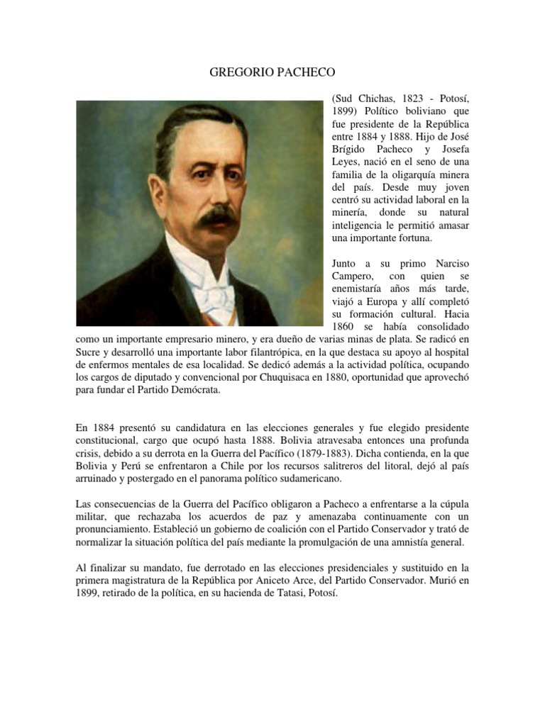 En 1884 present su candidatura en las elecciones generales y fue elegido presidente constitucional, cargo que ocup hasta 1888. Bolivia atravesaba entonces una profunda crisis, debido a su derrota en la Guerra del Pacfico (1879-1883). Dicha contienda, en la que Bolivia y Per se enfrentaron a Chile por los recursos salitreros del litoral, dej al pas arruinado y postergado en el panorama poltico sudamericano. Las consecuencias de la Guerra del Pacfico obligaron a Pacheco a enfrentarse a la cpula militar, que rechazaba los acuerdos de paz y amenazaba continuamente con un pronunciamiento. Estableci un gobierno de coalicin con el Partido Conservador y trat de normalizar la situacin poltica del pas mediante la promulgacin de una amnista general. Al finalizar su mandato, fue derrotado en las elecciones presidenciales y sustituido en la primera magistratura de la Repblica por Aniceto Arce, del Partido Conservador. Muri en 1899, retirado de la poltica, en su hacienda de Tatasi, Potos.