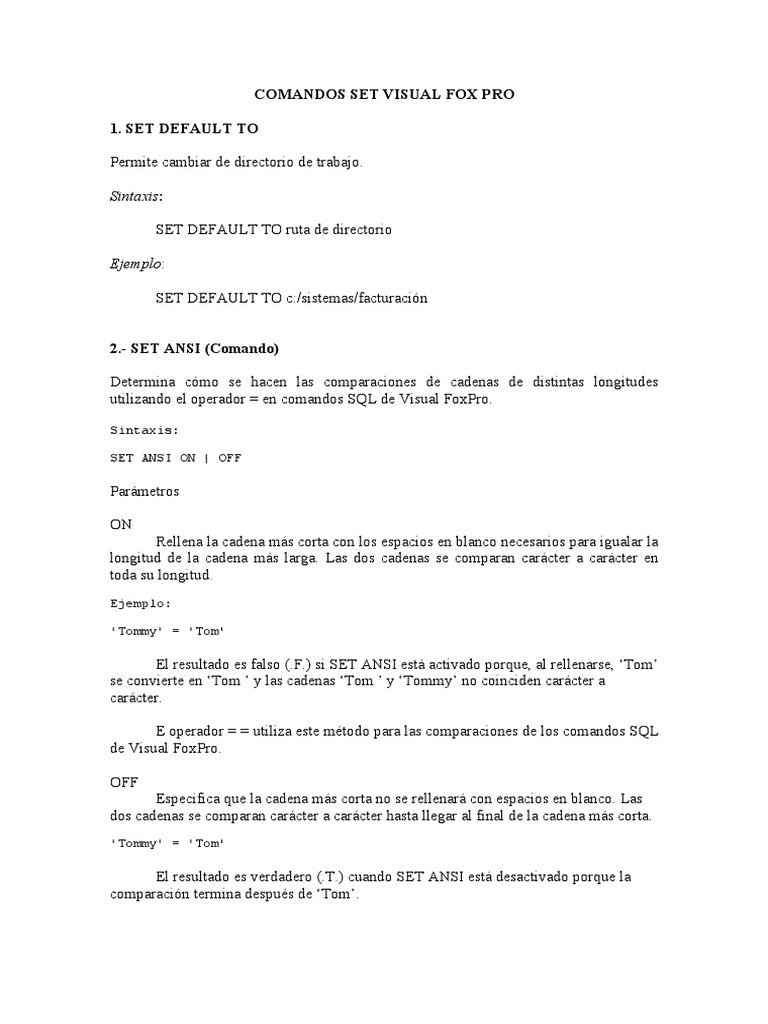Sintaxis: SET DEFAULT TO ruta de directorio Ejemplo: SET DEFAULT TO c:/sistemas/facturacin 2.- SET ANSI (Comando) Determina cmo se hacen las comparaciones de cadenas de distintas longitudes utilizando el operador = en comandos SQL de Visual FoxPro.