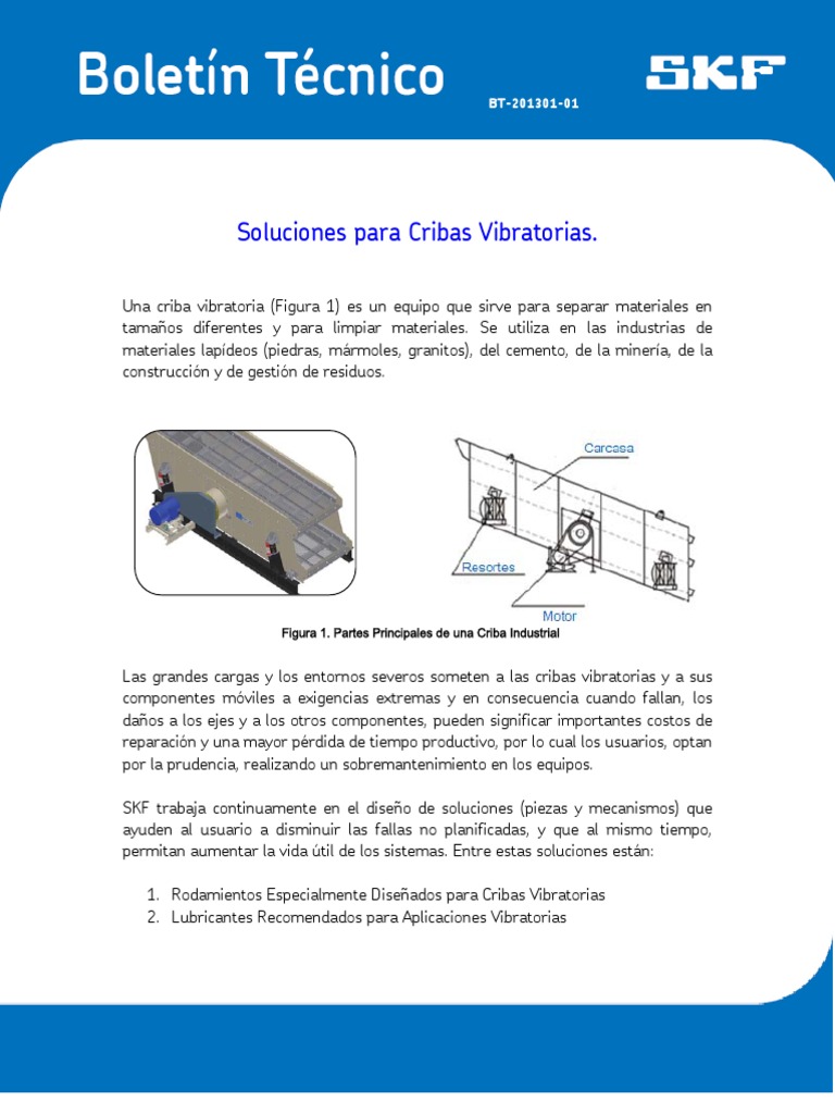 Las grandes cargas y los entornos severos someten a las cribas vibratorias y a sus componentes mviles a exigencias extremas y en consecuencia cuando fallan, los daos a los ejes y a los otros componentes, pueden significar importantes costos de reparacin y una mayor prdida de tiempo productivo, por lo cual los usuarios, optan por la prudencia, realizando un sobremantenimiento en los equipos. SKF trabaja continuamente en el diseo de soluciones (piezas y mecanismos) que ayuden al usuario a disminuir las fallas no planificadas, y que al mismo tiempo, permitan aumentar la vida til de los sistemas. Entre estas soluciones estn: 1. Rodamientos Especialmente Diseados para Cribas Vibratorias 2. Lubricantes Recomendados para Aplicaciones Vibratorias
