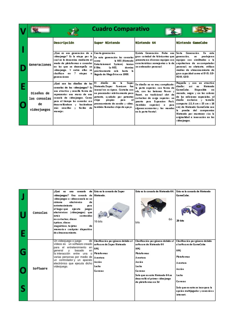 Clasificacin por gnero debido al Clasificacin por gnero debido software de Nintendo 64 al software de GameCube RPG Plataformas Aventura Accin Lucha Carreras Solo que en este Nintendo 64 se desarroll el primer videojuego de plataformas en 3d RPG Plataformas Aventura Accin Lucha Carreras Solo que en este se incorpora la opcin multijugador y conexin a internet.