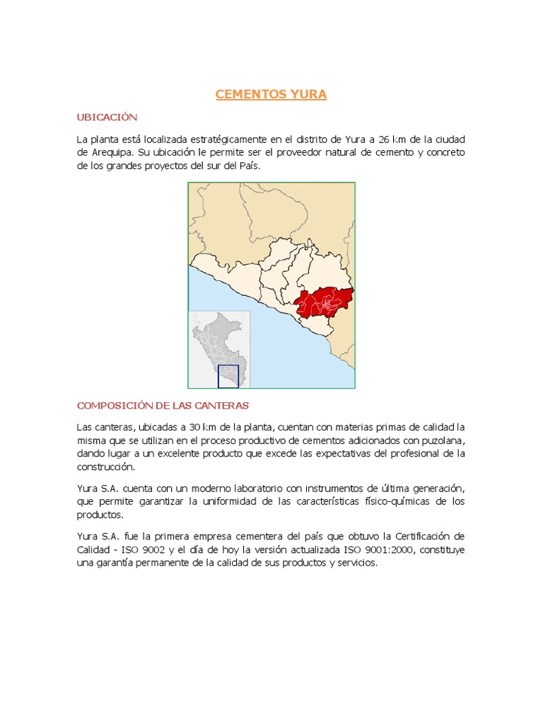 UBICACIN La planta est localizada estratgicamente en el distrito de Yura a 26 km de la ciudad de Arequipa. Su ubicacin le permite ser el proveedor natural de cemento y concreto de los grandes proyectos del sur del Pas.