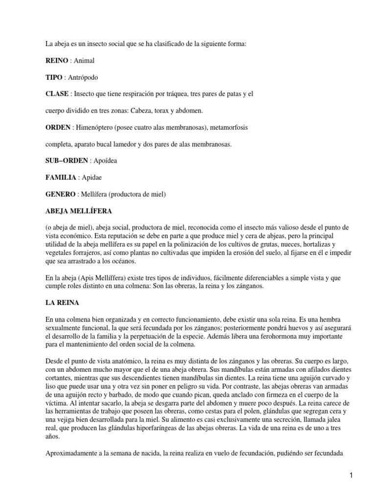 respiracin por trquea, tres pares de patas y el cuerpo dividido en tres zonas: Cabeza, torax y abdomen. ORDEN : Himenptero (posee cuatro alas membranosas), metamorfosis completa, aparato bucal lamedor y dos pares de alas membranosas. SUBORDEN : Apodea FAMILIA : Apidae GENERO : Mellfera (productora de miel) ABEJA MELLFERA (o abeja de miel), abeja social, productora de miel, reconocida como el insecto ms valioso desde el punto de vista econmico. Esta reputacin se debe en parte a que produce miel y cera de abjeas, pero la principal utilidad de la abeja mellfera es su papel en la polinizacin de los cultivos de grutas, nueces, hortalizas y vegetales forrajeros, as como plantas no cultivadas que impiden la erosin del suelo, al fijarse en l e impedir que sea arrastrado a los ocanos. En la abeja (Apis Mellffera) existe tres tipos de individuos, fcilmente diferenciables a simple vista y que cumple roles distinto en una colmena: Son las obreras, la reina y los znganos. LA REINA En una colmena bien organizada y en correcto funcionamiento, debe existir una sola reina. Es una hembra sexualmente funcional, la que ser fecundada por los znganos; posteriormente pondr huevos y as asegurar el desarrollo de la familia y la perpetuacin de la especie. Adems libera una ferohormona muy importante para el mantenimiento del orden social de la colmena. Desde el punto de vista anatmico, la reina es muy distinta de los znganos y las obreras. Su cuerpo es largo, con un abdomen mucho mayor que el de una abeja obrera. Sus mandbulas estn armadas con afilados dientes cortantes, mientras que sus descendientes tienen mandbulas sin dientes. La reina tiene una aguijn curvado y liso que puede usar una y otra vez sin poner en peligro su vida. Por contraste, las abejas obreras van armadas de una aguijn recto y barbado, de modo que cuando pican, queda anclado con firmeza en el cuerpo de la vctima. Al intentar sacarlo, la abeja se desgarra parte del abdomen y muere poco despus. La reina carece de las herramientas de trabajo que poseen las obreras, como cestas para el polen, glndulas que segregan cera y una vejiga bien desarrollada para la miel. Su alimento es casi exclusivamente una secrecin, llamada jalea real, que producen las glndulas hiporfarngeas de las abejas obreras. La vida de una reina es de uno a tres aos. Aproximadamente a la semana de nacida, la reina realiza en vuelo de fecundacin, pudindo ser fecundada 1