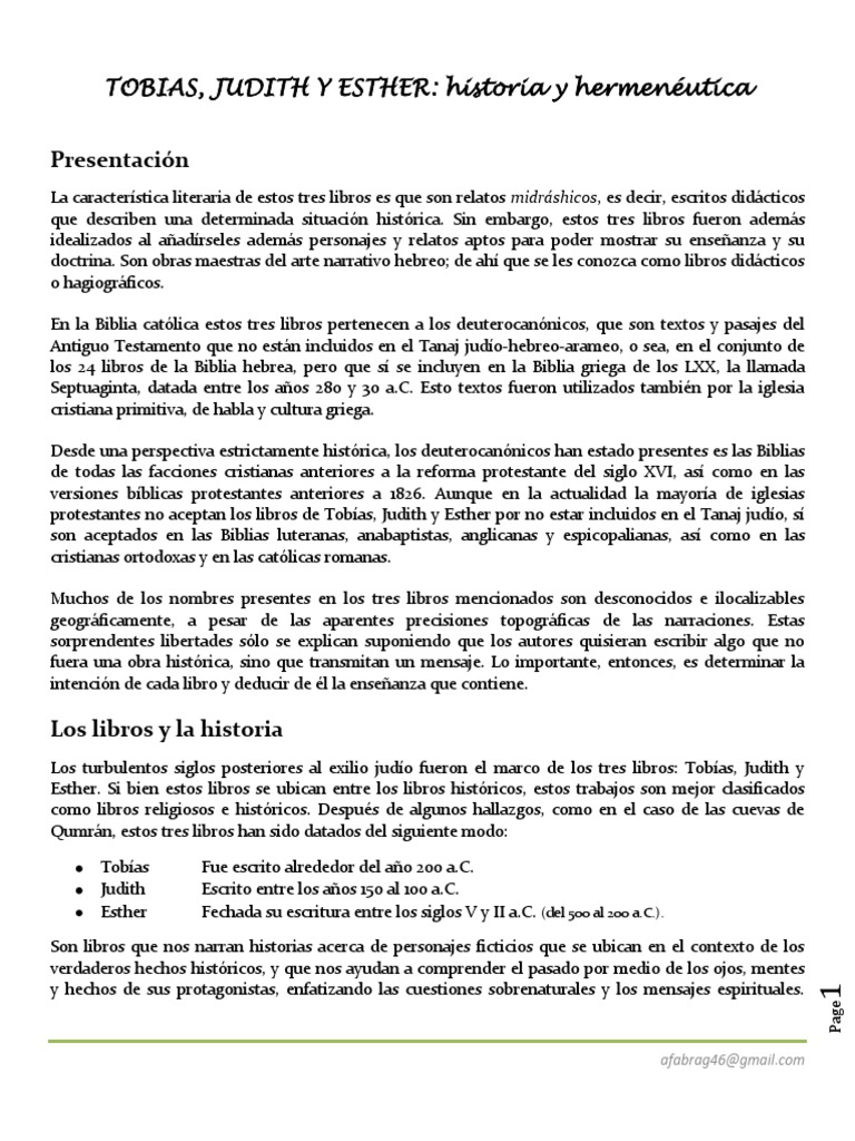 Los turbulentos siglos posteriores al exilio judo fueron el marco de los tres libros: Tobas, Judith y Esther. Si bien estos libros se ubican entre los libros histricos, estos trabajos son mejor clasificados como libros religiosos e histricos. Despus de algunos hallazgos, como en el caso de las cuevas de Qumrn, estos tres libros han sido datados del siguiente modo: Tobas Judith Esther Fue escrito alrededor del ao 200 a.C. Escrito entre los aos 150 al 100 a.C. Fechada su escritura entre los siglos V y II a.C. (del 500 al 200 a.C.).