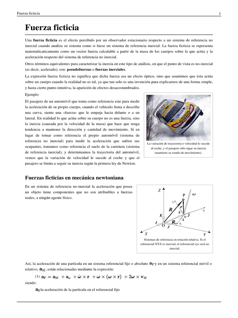 Una fuerza ficticia es el efecto percibido por un observador estacionario respecto a un sistema de referencia no inercial cuando analiza su sistema como si fuese un sistema de referencia inercial. La fuerza ficticia se representa matemticaticamente como un vector fuerza calculable a partir de la masa de los cuerpos sobre la que acta y la aceleracin respecto del sistema de referencia no inercial. Otros trminos equivalentes para caracterizar la inercia en este tipo de anlisis, en que el punto de vista es no-inercial (es decir, acelerado), son: pseudofuerzas o fuerzas inerciales. La expresin fuerza ficticia no significa que dicha fuerza sea un efecto ptico, sino que asumimos que sta acta sobre un cuerpo cuando la realidad no es tal, ya que tan solo es una invencin para explicarnos de una forma simple, y hasta cierto punto intuitiva, la aparicin de efectos desacostumbrados. Ejemplo El pasajero de un automvil que toma como referencia este para medir la aceleracin de su propio cuerpo, cuando el vehculo frena o describe una curva, siente una fuerza que le empuja hacia delante o a un lateral. En realidad lo que acta sobre su cuerpo no es una fuerza, sino la inercia (causada por la velocidad de la masa) que hace que tenga tendencia a mantener la direccin y cantidad de movimiento. Si en lugar de tomar como referencia el propio automvil (sistema de referencia no inercial) para medir la aceleracin que sufren sus ocupantes, tomamos como referencia el suelo de la carretera (sistema de referencia inercial), y determinamos la trayectoria del automvil, vemos que la variacin de velocidad le sucede al coche y que el pasajero se limita a seguir su inercia segn la primera ley de Newton.