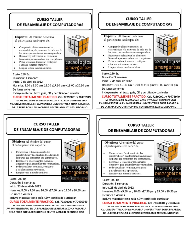 Costo: 150 Bs. Duracin: 3 semanas. Inicio: 2 de abril de 2012. Horarios: 8:00 a 9:30 am, 16:00 a17:30 pm y 19:00 a 20:30 pm De lunes a viernes. Incluye material: texto gua, CD y certificado curricular CURSO TOTALMENTE PRACTICO. Cel. 72390001 y 70476949