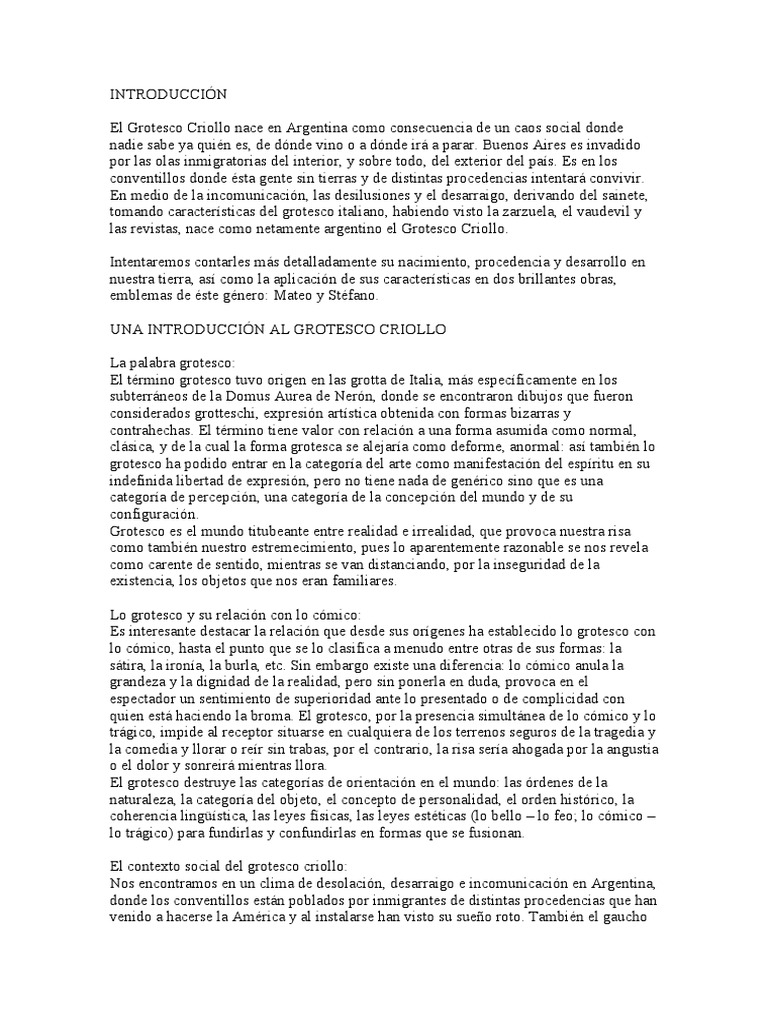 vino o a dnde ir a parar. Buenos Aires es invadido por las olas inmigratorias del interior, y sobre todo, del exterior del pas. Es en los conventillos donde sta gente sin tierras y de distintas procedencias intentar convivir. En medio de la incomunicacin, las desilusiones y el desarraigo, derivando del sainete, tomando caractersticas del grotesco italiano, habiendo visto la zarzuela, el vaudevil y las revistas, nace como netamente argentino el Grotesco Criollo. Intentaremos contarles ms detalladamente su nacimiento, procedencia y desarrollo en nuestra tierra, as como la aplicacin de sus caractersticas en dos brillantes obras, emblemas de ste gnero: Mateo y Stfano. UNA INTRODUCCIN AL GROTESCO CRIOLLO La palabra grotesco: El trmino grotesco tuvo origen en las grotta de Italia, ms especficamente en los subterrneos de la Domus Aurea de Nern, donde se encontraron dibujos que fueron considerados grotteschi, expresin artstica obtenida con formas bizarras y contrahechas. El trmino tiene valor con relacin a una forma asumida como normal, clsica, y de la cual la forma grotesca se alejara como deforme, anormal: as tambin lo grotesco ha podido entrar en la categora del arte como manifestacin del espritu en su indefinida libertad de expresin, pero no tiene nada de genrico sino que es una categora de percepcin, una categora de la concepcin del mundo y de su configuracin. Grotesco es el mundo titubeante entre realidad e irrealidad, que provoca nuestra risa como tambin nuestro estremecimiento, pues lo aparentemente razonable se nos revela como carente de sentido, mientras se van distanciando, por la inseguridad de la existencia, los objetos que nos eran familiares. Lo grotesco y su relacin con lo cmico: Es interesante destacar la relacin que desde sus orgenes ha establecido lo grotesco con lo cmico, hasta el punto que se lo clasifica a menudo entre otras de sus formas: la stira, la irona, la burla, etc. Sin embargo existe una diferencia: lo cmico anula la grandeza y la dignidad de la realidad, pero sin ponerla en duda, provoca en el espectador un sentimiento de superioridad ante lo presentado o de complicidad con quien est haciendo la broma. El grotesco, por la presencia simultnea de lo cmico y lo trgico, impide al receptor situarse en cualquiera de los terrenos seguros de la tragedia y la comedia y llorar o rer sin trabas, por el contrario, la risa sera ahogada por la angustia o el dolor y sonreir mientras llora. El grotesco destruye las categoras de orientacin en el mundo: las rdenes de la naturaleza, la categora del objeto, el concepto de personalidad, el orden histrico, la coherencia lingstica, las leyes fsicas, las leyes estticas (lo bello lo feo; lo cmico lo trgico) para fundirlas y confundirlas en formas que se fusionan. El contexto social del grotesco criollo: Nos encontramos en un clima de desolacin, desarraigo e incomunicacin en Argentina, donde los conventillos estn poblados por inmigrantes de distintas procedencias que han venido a hacerse la Amrica y al instalarse han visto su sueo roto. Tambin el gaucho