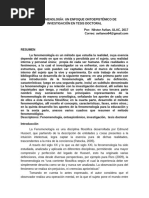 adicional sobre Marc Richir, as como las grabaciones de las conferencias que ste impartiera en octubre del 2010 en la Universidad de Oviedo, invitado tambin por la Sociedad Asturiana de Filosofa. Por lo dems, puede consultarse la riqusima pgina web montada por el fenomenlogo y compositor belga Sacha Carlson, uno de los mejores especialistas en la fenomenologa de Richir: [Link]. En breve publicar Brumaria, en colaboracin con Eikasia, la importante obra de Ricardo Snchez Ortiz de Urbina titulada Estromatologa. Teora de los niveles fenomenolgicos que supone, entre otros muchos aportes, una recepcin originalsima de la obra de Richir y un dilogo, a veces crtico, con el filsofo de origen valn, as como con el filsofo espaol Gustavo Bueno, otra de las fuentes de inspiracin de la originalsima obra de Urbina. Tras este breve recorrido histrico salpicado de apuntes relativos al presente y al futuro ms inminente, quisiera apuntar brevemente algunos aspectos generales de la fenomenologa. La fenomenologa constituye una forma de investigacin de la realidad basada en la experiencia que de ella hacemos. Ahora bien, el objeto entendido en su sentido ms genrico de la fenomenologa no es de fcil acceso. No lo es, como veremos, de puro inmediato y concreto, lbil, huidizo. Su inmediatez hace que, las ms veces, pase inadvertido: lo atravesamos una y otra vez. Qu son los fenmenos? Qu es el campo de los fenmenos, es decir, aquello que la fenomenologa trata de destilar, de despejar para llevar a cabo sus anlisis? Los fenmenos son las vivencias y lo que en las vivencias pero a sobrehaz de vivencia se vive. La fenomenologa es, a un tiempo, una intensificacin y una ampliacin de esa experiencia. Su mtodo, llamado reduccin fenomenolgica, produce una reconfiguracin de la experiencia tal como solemos vivirla o entenderla. Esa forma natural de vivir la experiencia se denomina actitud natural. Qu decir sobre la misma? La actitud natural alberga una serie de tesis mnimas sobre la realidad y sobre la experiencia. Contiene, si se quiere, una autointerpretacin de la experiencia: la entiende como parte ingrediente de la realidad. Lo propio de la actitud natural consiste en pensarlo todo segn una serie de relaciones de englobamientos sucesivos en el lmite de los cuales estara el todo del universo. Eso que llamamos experiencia acontece en determinadas partes del mundo, aquellas partes que reciben el nombre de sujetos. Ser esa autointepretacin (auto-englobaba en un universo estable) lo que la fenomenologa tratar de cortocircuitar). Efectivamente, la fenomenologa produce un vuelco en esta forma de ver las cosas al entronizar la experiencia como nos dir Husserl transcendental, como algo que estamos continuamente atravesando sin percatarnos de ello, y como aquello en que ha de situarse el centro de filosofar: ya no en el mundo o en algn ente privilegiado (Dios, o el sujeto, el todo del universo, las ideas platnicas) sino en la experiencia misma que de todo ello tuviremos. Incluso la tesis que limita y residencia a la 2