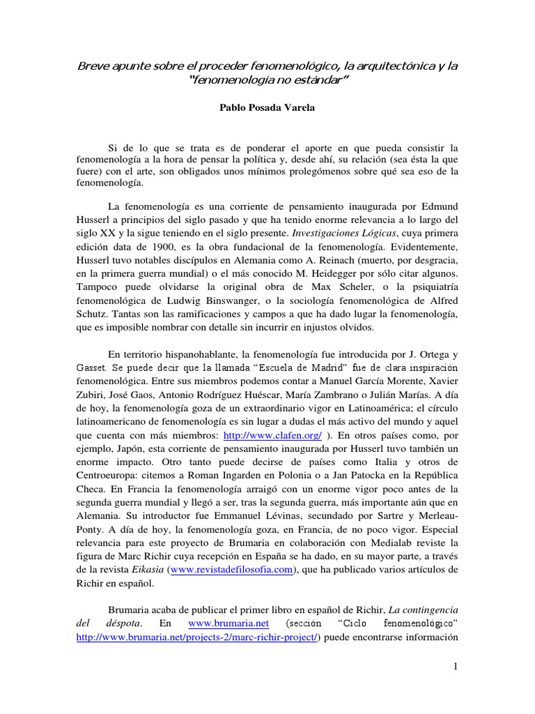 Si de lo que se trata es de ponderar el aporte en que pueda consistir la fenomenologa a la hora de pensar la poltica y, desde ah, su relacin (sea sta la que fuere) con el arte, son obligados unos mnimos prolegmenos sobre qu sea eso de la fenomenologa. La fenomenologa es una corriente de pensamiento inaugurada por Edmund Husserl a principios del siglo pasado y que ha tenido enorme relevancia a lo largo del siglo XX y la sigue teniendo en el siglo presente. Investigaciones Lgicas, cuya primera edicin data de 1900, es la obra fundacional de la fenomenologa. Evidentemente, Husserl tuvo notables discpulos en Alemania como A. Reinach (muerto, por desgracia, en la primera guerra mundial) o el ms conocido M. Heidegger por slo citar algunos. Tampoco puede olvidarse la original obra de Max Scheler, o la psiquiatra fenomenolgica de Ludwig Binswanger, o la sociologa fenomenolgica de Alfred Schutz. Tantas son las ramificaciones y campos a que ha dado lugar la fenomenologa, que es imposible nombrar con detalle sin incurrir en injustos olvidos. En territorio hispanohablante, la fenomenologa fue introducida por J. Ortega y Gasset. Se puede decir que la llamada Escuela de Madrid fue de clara inspiracin fenomenolgica. Entre sus miembros podemos contar a Manuel Garca Morente, Xavier Zubiri, Jos Gaos, Antonio Rodrguez Huscar, Mara Zambrano o Julin Maras. A da de hoy, la fenomenologa goza de un extraordinario vigor en Latinoamrica; el crculo latinoamericano de fenomenologa es sin lugar a dudas el ms activo del mundo y aquel que cuenta con ms miembros: [Link] ). En otros pases como, por ejemplo, Japn, esta corriente de pensamiento inaugurada por Husserl tuvo tambin un enorme impacto. Otro tanto puede decirse de pases como Italia y otros de Centroeuropa: citemos a Roman Ingarden en Polonia o a Jan Patocka en la Repblica Checa. En Francia la fenomenologa arraig con un enorme vigor poco antes de la segunda guerra mundial y lleg a ser, tras la segunda guerra, ms importante an que en Alemania. Su introductor fue Emmanuel Lvinas, secundado por Sartre y MerleauPonty. A da de hoy, la fenomenologa goza, en Francia, de no poco vigor. Especial relevancia para este proyecto de Brumaria en colaboracin con Medialab reviste la figura de Marc Richir cuya recepcin en Espaa se ha dado, en su mayor parte, a travs de la revista Eikasia ([Link]), que ha publicado varios artculos de Richir en espaol. Brumaria acaba de publicar el primer libro en espaol de Richir, La contingencia del dspota. En [Link] (seccin Ciclo fenomenolgico [Link] puede encontrarse informacin 1