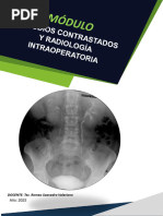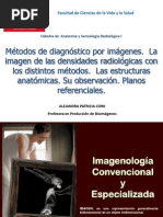 Formacin de la imagen Las imgenes radiolgicas se obtienen al someter la regin anatmica en exploracin a un haz de rayos X que, por sus propiedades, se absorber en mayor o menor proporcin segn el nmero atmico, la densidad y el espesor de las estructuras atravesadas. De la radiacin homognea (igual intensidad en toda direccin) que ha incidido sobre el paciente, parte se dispersa y parte atraviesa las estructuras orgnicas, saliendo as del paciente un haz heterogneo (distinta intensidad en cada direccin), como consecuencia de la absorcin del medio que atraves. De aqu se derivan dos conceptos esenciales claves para la formacin de la imagen: la densidad y el contraste. La densidad depende principalmente de la dosis de radiacin empleada en el estudio y es el producto de la intensidad I de radiacin (mA) por el tiempo T que acta (seg). Sobre la pelcula, una mayor dosis producir un mayor ennegrecimiento o densidad. Segn la ley del cuadrado de la distancia, la intensidad de los rayos X es inversamente proporcional al cuadrado de la distancia. Las 5 densidades radiolgicas bsicas apreciables en una pantalla fluoroscpica o pelcula radiogrfica en orden creciente de capacidad de absorcin o densidad son: DENSIDAD AIRE: producida por regiones gaseosas muy radiotransparentes, lo cual generan un color negro en la pelcula. DENSIDAD GRASA: originada por tejido adiposo, moderadamente radiotransparente. DENSIDAD AGUA: caracterstica de los tejidos blandos como la sangre, los msculos, la bilis, las vsceras y cartlagos. Se visualiza como de tonalidad intermedia. DENSIDAD HUESO: originada por huesos, dientes y sales clcicas. Moderadamente radiopaca. DENSIDAD METAL: causada por los contrastes artificiales de sustancias teraputicas como el bario y el yodo, y tambin por la presencia de prtesis metlicas. Son muy radiopacas y se observan de color blanco en la pelcula.