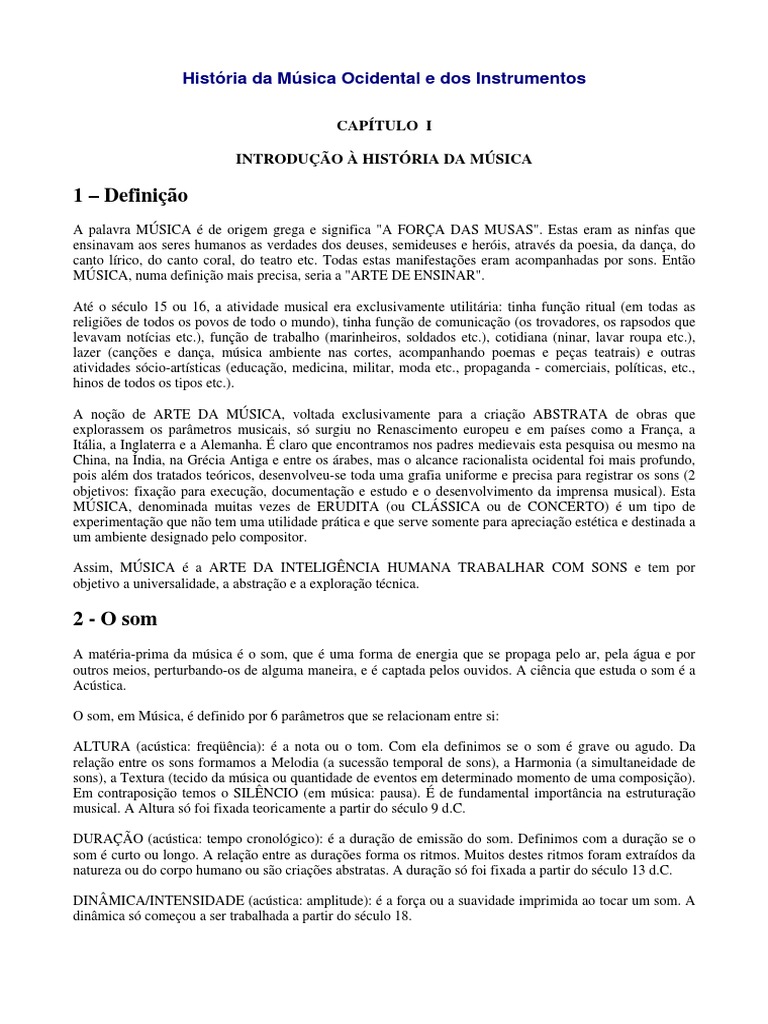 A noo de Histria da Msica praticamente recente. Tem uns 150 a 200 anos no mximo. Os primeiros historiadores da msica (e da Histria Geral - poltica, econmica, social etc.) comearam a organizar tudo com o nacionalismo romntico no incio do sculo 19. Tudo era narrado atravs de fatos bastante vagos e lendrios e dataes imprecisas e arbitrrias. Na msica isto se agravava porque muitos registros e at partituras desapareciam rapidamente. O repertrio praticamente se constitua de estrias, porque a imensa maioria das peas era feita para uma nica ocasio ou era tocada logo depois de composta e, sem ser grosseiro, a msica era considerada um artigo suprfluo e descartvel, apesar da sua estreita colaborao nos rituais religiosos e em festas polticas. E esta histria comeava em Bach (recm descoberto) e terminava em Wagner - no mximo. No sculo 20, ampliou-se com a incluso da msica medieval (cantos gregorianos, danas e o repertrio dos menestris, trovadores etc.), os coralistas renascentistas e a peras do sculo 17, desde Monteverdi, Lully e outros e os compositores do Modernismo (Debussy, Stravinsky, Bartk, etc.). Assim, a Histria da Msica que estudamos a Histria da Msica da Europa Ocidental. Esta msica no a nica, no a mais importante e no melhor do que a de outros povos e civilizaes. aquela na qual estamos inseridos culturalmente e que aprendemos e trabalhamos todo o seu arcabouo terico, tocamos os instrumentos inventados ou desenvolvidos por ela e elegemos os compositores daquele continente como nossos modelos. Alm disto ns delimitamos seu estudo a partir da Idade Mdia, mais precisamente aquelas msicas registradas depois do sculo 7. As msicas dos perodos Primitivo e Antigidade (civilizaes egpcias, mesopotmicas, gregas, romanas e de outros povos) e do incio da Idade Mdia esto perdidas, apesar do trabalho arqueomusicolgico. O que nos resta so pinturas ou esculturas de msicos, referncias literrias ou religiosas, instrumentos, algumas teorias musicais e supostas "partituras", tudo muito fragmentado, disperso e precrio. De qualquer forma, o que influenciou a msica europia foram as teorias gregas (modificadas pelos interesses dos tericos medievais) e a contnua utilizao de diversos instrumentos daquelas civilizaes antigas. A prtica musical dos judeus influenciou os cnticos dos cristos. As atividades musicais dos povos germnicos e dos rabes influenciaram toda a msica profana medieval com seus instrumentos, formas, ritmos e estruturaes harmnicas. As msicas chinesas, indianas e de outros povos asiticos, possuem uma estrutura diferente e uma histria independente, que pouco se relacionou com a da Europa, a no ser em pocas mais prximas. As msicas dos africanos, dos amerndios e dos ocenicos s agora esto merecendo pesquisas cientficas etnomusicolgicas mais profundas.
