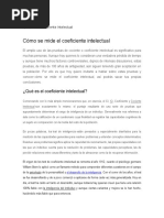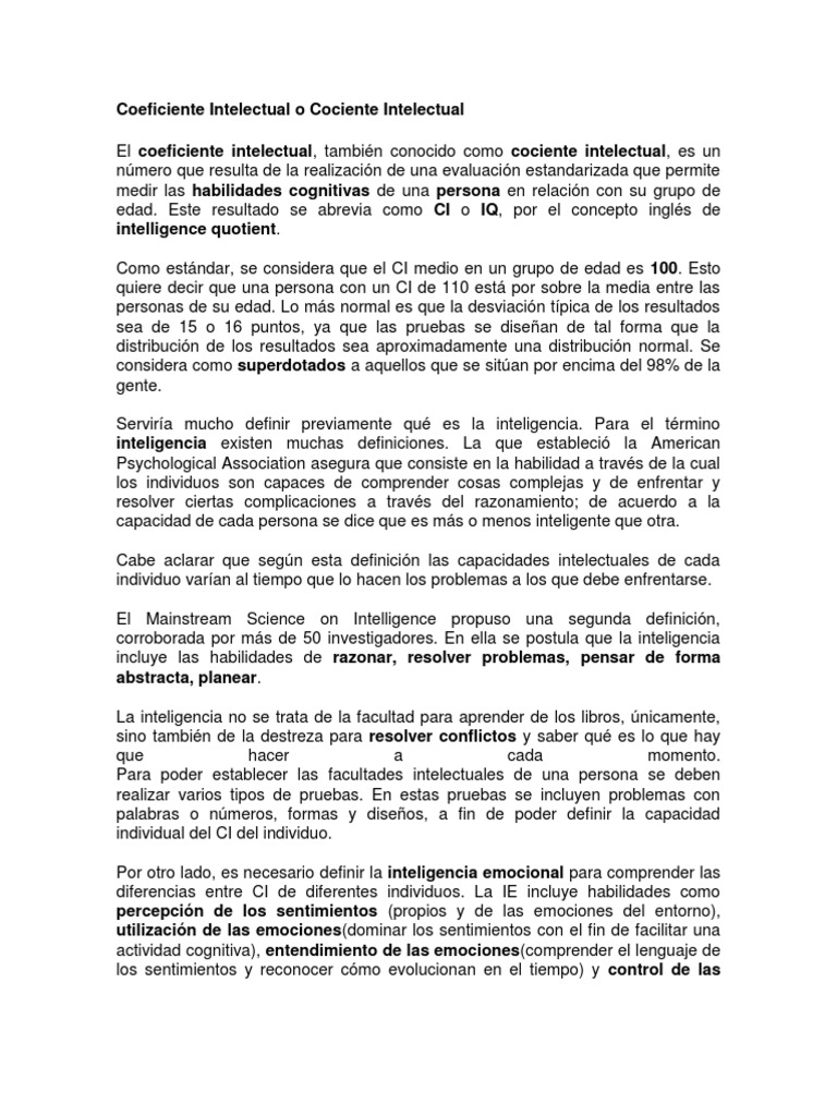 Coeficiente Intelectual o Cociente Intelectual El coeficiente intelectual, tambin conocido como cociente intelectual, es un nmero que resulta de la realizacin