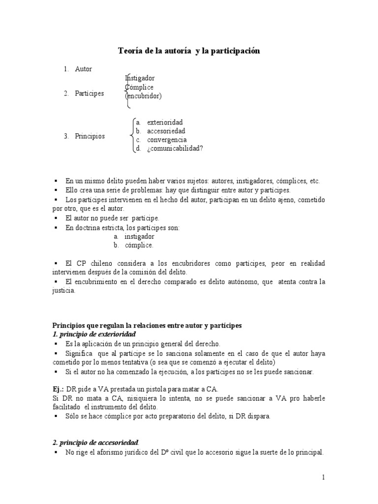 El principal problema es el del concepto de autor que tiene que ser de tal naturaleza que cubre a todas las categoras. La doctrina discute todava, no se ha puesto de acuerdo. Al respecto ha habido distintas teoras y doctrinas. 1. Teora subjetiva (siglo XIX) Es autor el que tiene voluntad de autor y que tiene inters en el resultado. Segn este concepto, se condena como cmplice a la nana si una patrona ordena a ahogar a su bebe. Si la nana ahoga al bebe, es cmplice, y la madre sera autora. Esta teora ya no es seguida en la doctrina. 2. Teora causal Es autor el que contribuye causalmente con la produccin del delito. El que realiza una conducta que es causalmente idnea, eficaz del delito. Esta teora es insatisfactoria porque de acuerdo a ella, el cmplice tambin sera autor porque contribuye causalmente al delito. 3. Teora formal Fue desarrollada por Beling, representante del causalismo naturalista y quien desarrollo la tipicidad, por lo que ve todo desde el punto de vista de la tipicidad. Es autor el que ejecute la accin tpica, el que realiza el tipo legal.