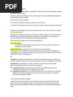 2. significa que el instigador debe instigar a la realizacin de un hecho concreto, determinado, y no genrico. (Goethe, Werther) el jefe de la mafia slo da instrucciones generales, no es instigador. Problema qu pasa si existe divergencia entre: a. lo instigado b. lo realizado, ejecutado. Si se instig a un homicidio, pero se realiza slo una amenaza, o si se instig a una paliza y el sujeto lo mata. Cmo se sanciona Hay que distinguir: a. el instigado hace ms: Scale la cresta, pero el instigado lo mata. El instigador es responsable por las lesiones, por lo que instig. Ello por el principio de la convergencia subjetiva. b. el instigado hace menos: Mtalo, peor el instigado slo lo lesiona. El instigador se condena a ttulo de lesiones por le principio de accesoriedad: slo por lo efectivamente realizado por el autor. (lesiones) c. el instigado realiza algo diferente: Mtalo, pero el instigado slo amenaza. En este caso el instigador no tiene responsabilidad penal porque el instigado realiza algo diferente a lo instigado 2. Los cmplices La idea fundamental en esta materia es la de la cooperacin. Es el que coopera con el autor para la realizacin del delito, por hechos anteriores o simultneas al hecho punible. Por ejemplo facilita el arma antes o en el momento del delito. Esta cooperacin tiene que ser : a. real, o sea que efectivamente exista, y no imaginaria b. eficaz, tiene que contribuir real y eficazmente a la realizacin del delito. Debe haber servido para la realizacin del delito. Ej.: A y B prestan a Claudio una pistola para que ste mate a D. Claudio mata a D con la pistola de A y B no puede ser sancionado por cmplice, no fue ni eficaz ni real su cooperacin. As, depende del azar la complicidad, pero es as.