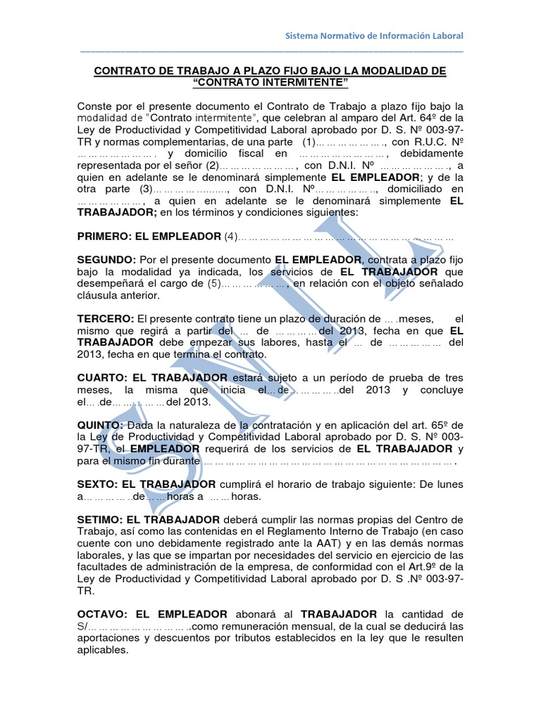 CONTRATO DE TRABAJO A PLAZO FIJO BAJO LA MODALIDAD DE CONTRATO INTERMITENTE Conste por el presente documento el Contrato de Trabajo a plazo fijo bajo la modalidad de Contrato intermitente, que celebran al amparo del Art. 64 de la Ley de Productividad y Competitividad Laboral aprobado por D. S. N 003-97TR y normas complementarias, de una parte (1)., con R.U.C. N . y domicilio fiscal en , debidamente representada por el seor (2), con D.N.I. N ., a quien en adelante se le denominar simplemente EL EMPLEADOR; y de la otra parte (3).........., con D.N.I. N.., domiciliado en , a quien en adelante se le denominar simplemente EL TRABAJADOR; en los trminos y condiciones siguientes: PRIMERO: EL EMPLEADOR (4) SEGUNDO: Por el presente documento EL EMPLEADOR, contrata a plazo fijo bajo la modalidad ya indicada, los servicios de EL TRABAJADOR que desempear el cargo de (5), en relacin con el objeto sealado clusula anterior. TERCERO: El presente contrato tiene un plazo de duracin de . meses, el mismo que regir a partir del de del 2013, fecha en que EL TRABAJADOR debe empezar sus labores, hasta el de del 2013, fecha en que termina el contrato. CUARTO: EL TRABAJADOR estar sujeto a un perodo de prueba de tres meses, la misma que inicia elde..del 2013 y concluye el.dedel 2013. QUINTO: Dada la naturaleza de la contratacin y en aplicacin del art. 65 de la Ley de Productividad y Competitividad Laboral aprobado por D. S. N 00397-TR, el EMPLEADOR requerir de los servicios de EL TRABAJADOR y para el mismo fin durante . SEXTO: EL TRABAJADOR cumplir el horario de trabajo siguiente: De lunes a..dehoras a horas. SETIMO: EL TRABAJADOR deber cumplir las normas propias del Centro de Trabajo, as como las contenidas en el Reglamento Interno de Trabajo (en caso cuente con uno debidamente registrado ante la AAT) y en las dems normas laborales, y las que se impartan por necesidades del servicio en ejercicio de las facultades de administracin de la empresa, de conformidad con el Art.9 de la Ley de Productividad y Competitividad Laboral aprobado por D. S .N 003-97TR. OCTAVO: EL EMPLEADOR abonar al TRABAJADOR la cantidad de S/..como remuneracin mensual, de la cual se deducir las aportaciones y descuentos por tributos establecidos en la ley que le resulten aplicables.