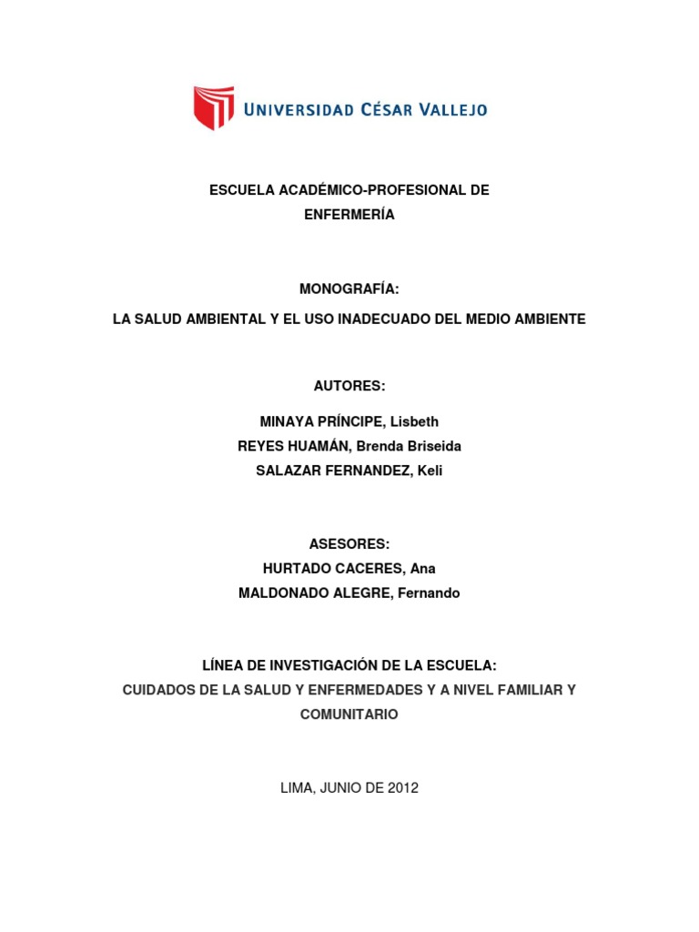La salud ambiental refleja el nivel de desarrollo econmico y social alcanzado por un pas, esto depende de una serie de factores como la alimentacin inocua y de calidad, vivienda saludable, trabajo digno, educacin integral, condiciones ambientales saludables, entre otros. La salud ambiental es un derecho social y como tal es transversal a todos lo sectores del estado. Por ello, es importante resaltar la salud ambiental como una condicin indispensable del desarrollo humano y alcanzar el bienestar individual y colectivo. Las relaciones de causalidad entre el ambiente contaminado y la salud humana son mltiples y complejas, reflejndose en el incremento de enfermedades diarreicas y parasitarias por la escasez de agua y alimentos no seguros para el consumo humano, las infecciones respiratorias agudas por contaminacin del aire, enfermedades transmisibles por la proliferacin de vectores y roedores, etctera. Por ello, es necesario que se ejecuten acciones de vigilancia y control que permitan prevenir los efectos negativos en la salud de las personas que usualmente son padecidos por los ms pobres. Este trabajo monogrfico comprende tres captulos: el primero abarca conceptos generales; el segundo, el uso inadecuado del medio ambiente y el tercero ilustra aspectos ambientales. En ese sentido, a travs de la presente investigacin, se plantea el conjunto de lineamientos, objetivos y estrategias que se deben desarrollar, en los prximos aos, para reducir los riesgos ambientales relacionados con la salud, contribuyendo con ello a mejorar el estado de salud y la calidad de vida de los ciudadanos del Per.