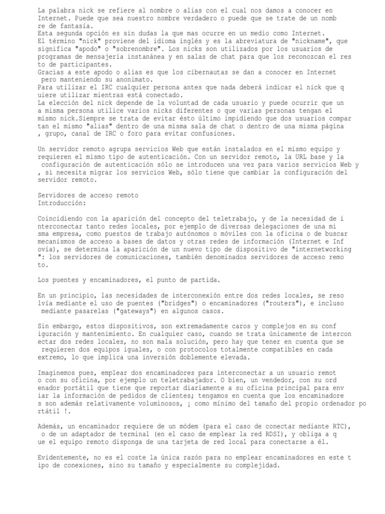 Puede que sea nuestro nombre verdadero o puede que se trate de un nomb re de fantasa. Esta segunda opcin es sin dudas la que mas ocurre en un medio como Internet. El trmino "nick" proviene del idioma ingls y es la abreviatura de "nickname", que significa "apodo" o "sobrenombre". Los nicks son utilizados por los usuarios de programas de mensajera instannea y en salas de chat para que los reconozcan el res to de participantes. Gracias a este apodo o alias es que los cibernautas se dan a conocer en Internet pero manteniendo su anonimato. Para utilizar el IRC cualquier persona antes que nada deber indicar el nick que q uiere utilizar mientras est conectado. La eleccin del nick depende de la voluntad de cada usuario y puede ocurrir que un a misma persona utilice varios nicks diferentes o que varias personas tengan el mismo nick.Siempre se trata de evitar sto ltimo impidiendo que dos usuarios compar tan el mismo "alias" dentro de una misma sala de chat o dentro de una misma pgina , grupo, canal de IRC o foro para evitar confusiones. Un servidor remoto agrupa servicios Web que estn instalados en el mismo equipo y requieren el mismo tipo de autenticacin. Con un servidor remoto, la URL base y la configuracin de autenticacin slo se introducen una vez para varios servicios Web y , si necesita migrar los servicios Web, slo tiene que cambiar la configuracin del servidor remoto. Servidores de acceso remoto Introduccin: Coincidiendo con la aparicin del concepto del teletrabajo, y de la necesidad de i nterconectar tanto redes locales, por ejemplo de diversas delegaciones de una mi sma empresa, como puestos de trabajo autnomos o mviles con la oficina o de buscar mecanismos de acceso a bases de datos y otras redes de informacin (Internet e Inf ova), se determina la aparicin de un nuevo tipo de dispositivo de "internetworking ": los servidores de comunicaciones, tambin denominados servidores de acceso remo to. Los puentes y encaminadores, el punto de partida. En un principio, las necesidades de interconexin entre dos redes locales, se reso lva mediante el uso de puentes ("bridges") o encaminadores ("routers"), e incluso mediante pasarelas ("gateways") en algunos casos. Sin embargo, estos dispositivos, son extremadamente caros y complejos en su conf iguracin y mantenimiento. En cualquier caso, cuando se trata nicamente de intercon ectar dos redes locales, no son mala solucin, pero hay que tener en cuenta que se requieren dos equipos iguales, o con protocolos totalmente compatibles en cada extremo, lo que implica una inversin doblemente elevada. Imaginemos pues, emplear dos encaminadores para interconectar a un usuario remot o con su oficina, por ejemplo un teletrabajador. O bien, un vendedor, con su ord enador porttil que tiene que reportar diariamente a su oficina principal para env iar la informacin de pedidos de clientes; tengamos en cuenta que los encaminadore s son adems relativamente voluminosos, como mnimo del tamao del propio ordenador po rttil !. Adems, un encaminador requiere de un mdem (para el caso de conectar mediante RTC), o de un adaptador de terminal (en el caso de emplear la red RDSI), y obliga a q ue el equipo remoto disponga de una tarjeta de red local para conectarse a l. Evidentemente, no es el coste la nica razn para no emplear encaminadores en este t ipo de conexiones, sino su tamao y especialmente su complejidad.