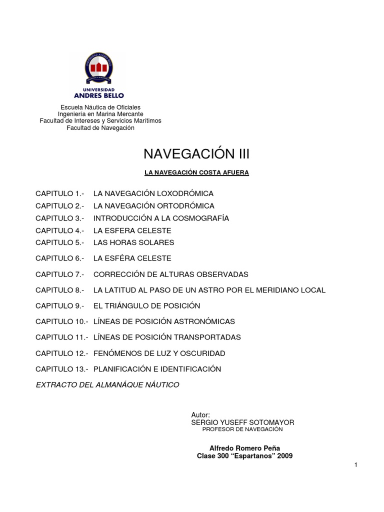 CAPITULO 10.- LNEAS DE POSICIN ASTRONMICAS CAPITULO 11.- LNEAS DE POSICIN TRANSPORTADAS CAPITULO 12.- FENMENOS DE LUZ Y OSCURIDAD CAPITULO 13.- PLANIFICACIN E IDENTIFICACIN EXTRACTO DEL ALMANQUE NUTICO