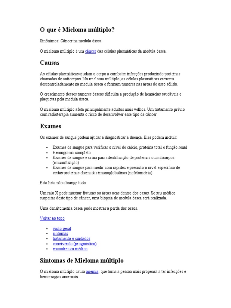 Sinnimos: Cncer na medula ssea O mieloma mltiplo um cncer das clulas plasmticas da medula ssea.
