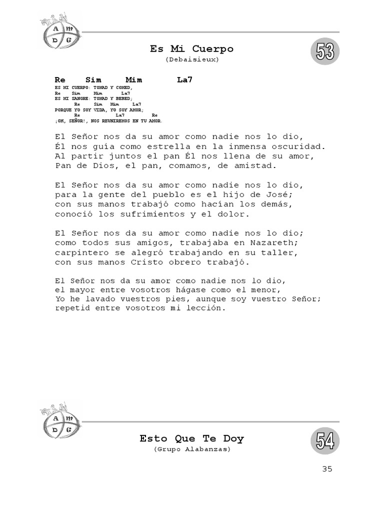 ES MI CUERPO: TOMAD Y COMED, Re Sim Mim La7 ES MI SANGRE: TOMAD Y BEBED; Re Sim Mim La7 PORQUE YO SOY VIDA, YO SOY AMOR; Re La7 Re OH, SEOR!, NOS REUNIREMOS EN TU AMOR.