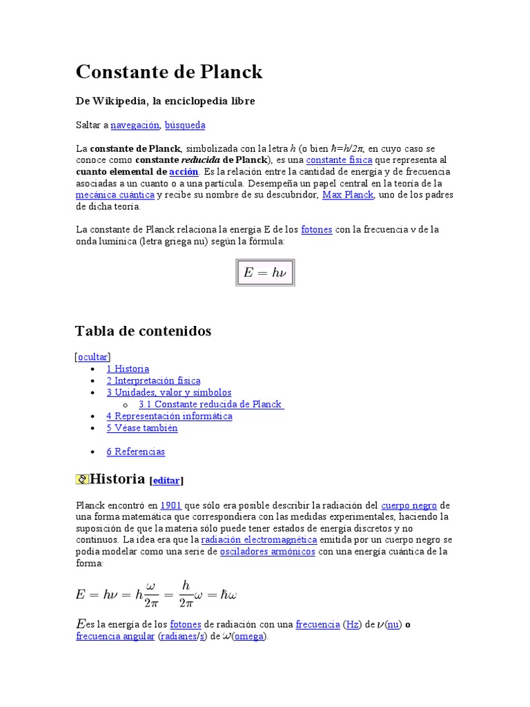 [ocultar] 1 Historia 2 Interpretacin fsica 3 Unidades, valor y smbolos o 3.1 Constante reducida de Planck 4 Representacin informtica 5 Vase tambin