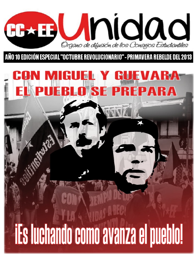 Ante una nueva conmemoracin de la cada en combate del Comandante Ernesto Guevara y el Secretario General del Movimiento de Izquierda Revolucionaria (MIR) Miguel Enrquez, se nos hace necesario hoy y en cada momento de la Historia, rescatar su legado, desde lo ideolgico-prctico hasta su condicin valrica que impregna nuestros das jvenes. Guevara, ha sido un referente y sintetizador de las luchas en cada espacio y rincn de este pueblo llamado Latinoamrica, y es por ello que su rostro aparece plasmado en muchos lugares donde la resistencia se vive da a da. Aun as, no aludimos a ese rostro del Che que ha sido usurpado por el imperialismo y la burguesa, convirtindolo en un producto, una mercanca... ms no es sino la expresin del Hombre y Mujer Nueva la que fortalece nuestras convicciones. El Che era marxista-leninista y hoy construimos desde su legado y nos nutrimos de sus enseanzas para enfrentar los nuevos desafos. Con Miguel y el MIR encontramos nuestro caso ms cercano, compaeros y compaeras que siguiendo el ejemplo de la revolucin cubana y el guevarismo, continuaron la alternativa ms difcil y noble: la construccin del Proyecto Revolucionario de los pobres del campo y la ciudad. Desde ese guevarismo que no vende sus principios esenciales se estableci una conexin coherente entre lo ideolgico y la praxis y he aqu donde radica la importancia fundamental de Miguel y el Che. Nuestros mrtires no se fueron con su muerte, porque distintas manos levantan las suyas. No nos fuimos, ac estamos dignos y rebeldes, luchadoras y revolucionarias, enfrentado problemticas distintas, pero de la misma raz, con la conviccin y fuerza vigente, con la juventud venciendo miedos, con un pueblo herido que cuestiona quien lo hiere, con Miguel y Guevara como ejemplo de camino y de lucha incesable, hasta vencer o morir.