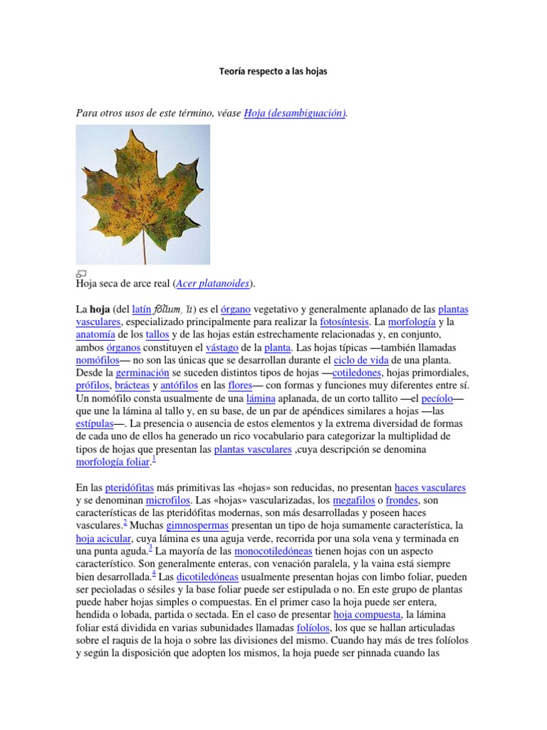 1. Jump up to: a b Jrgen R. Hoppe. 5 Morphologie des Blattes (en alemn). Allgemeine Botanik pg. 56 pgs. 70. Alemania: Institut fr Systematische Botanik und kologie, Universitt Ulm. Consultado el 10 de setiembre de 2011. 2. Jump up to: a b c Gonzlez, A.M. & Arbo, M.M.. Organizacin del cuerpo de la planta. Tema 2: Hoja, 2.7. Hojas de Pteridofitas (en espaol). Morfologa de Plantas Vasculares. Argentina: Universidad Nacional del Nordeste. Consultado el 10 de setiembre de 2010. 3. Jump up to: a b Gonzlez, A.M. & Arbo, M.M.. Organizacin del cuerpo de la planta. Tema 2: Hoja, Hojas de Gimnospermas (en espaol). Morfologa de Plantas Vasculares. Argentina: Universidad Nacional del Nordeste. Consultado el 10 de setiembre de 2010. 4. Jump up to: a b c d e f Gonzlez, A.M. & Arbo, M.M.. Organizacin del cuerpo de la planta. Tema 2: Hoja. 2.5. Hoja de Monocotiledneas (en espaol). Morfologa de Plantas Vasculares. Argentina: Universidad Nacional del Nordeste. Consultado el 10 de setiembre de 2010. 5. Jump up to: a b c d Gonzlez, A.M. & Arbo, M.M.. Organizacin del cuerpo de la planta. Tema 2: Hoja. 2.2. Hoja de Dicotiledneas (en espaol). Morfologa de Plantas Vasculares. Argentina: Universidad Nacional del Nordeste. Consultado el 10 de setiembre de 2010. 6. Jump up to: a b c Coder, K.D. 1999. [[Link] Falling Tree Leaves: Leaf Abscission] University of Georgia Daniel [Link] School of Forest Resources Extension publication. 7. Jump up to: a b c d e Gonzlez, A.M. & Arbo, M.M.. Organizacin del cuerpo de la planta. Tema 21: Anatoma foliar. 21.10. Abscisin (en espaol). Morfologa de Plantas Vasculares. Argentina: Universidad Nacional del Nordeste. Consultado el 10 de junio de 2011. 8. Jump up to: a b Clifford M. N.(2000): Anthocyanins nature, occurrence and dietary burden. In: Journal of the Science of Food and Agriculture. Bd. 80, Nr. 7, S. 10631072. doi <1063::AID-JSFA605>[Link];2-Q 10.1002/(SICI)10970010(20000515)80:7<1063::AID-JSFA605>[Link];2-Q 9. Jump up to: a b c Gonzlez, A.M. & Arbo, M.M.. Organizacin del cuerpo de la planta. Tema 2: Hoja, 2.1. Definicin, origen, funcin y sucesin foliar (en espaol). Morfologa de Plantas Vasculares. Argentina: Universidad Nacional del Nordeste. Consultado el 10 de setiembre de 2010. 10. Jump up to: a b c Strassburger, E. 1994. Tratado de Botnica. 8va. edicin. Omega, Barcelona, 1088 p. ISBN 84-7102-990-1 11. Jump up to: a b c d e Gola, G., Negri, G. y Cappeletti, C. 1965. Tratado de Botnica. 2da. edicin. Editorial Labor S.A., Barcelona, 1110 p. 12. Jump up Charles R. Tischler, Justin D. Derner, H. Wayne Polley, and Hyrum B. Johnson, Response of Seedlings of Two Hypogeal Brush Species to CO2 Enrichment, Fort Collins, CO: U.S. Department of Agriculture, Forest Service, Rocky Mountain Research Station, pp. 104106, [Link] 13. Jump up Baraloto, C. (2007), Seed size, seedling morphology, and response to deep shade and damage in neotropical rain forest trees, American Journal of Botany 94: 901,