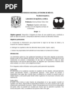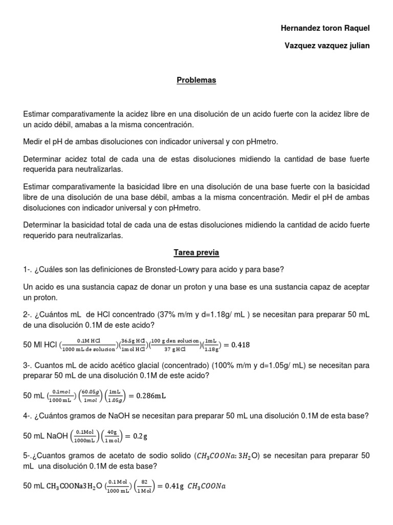 Estimar comparativamente la acidez libre en una disolucin de un acido fuerte con la acidez libre de un acido dbil, amabas a la misma concentracin. Medir el pH de ambas disoluciones con indicador universal y con pHmetro. Determinar acidez total de cada una de estas disoluciones midiendo la cantidad de base fuerte requerida para neutralizarlas. Estimar comparativamente la basicidad libre en una disolucin de una base fuerte con la basicidad libre de una disolucin de una base dbil, ambas a la misma concentracin. Medir el pH de ambas disoluciones con indicador universal y con pHmetro. Determinar la basicidad total de cada una de estas disoluciones midiendo la cantidad de acido fuerte requerido para neutralizarlas. Tarea previa 1-. Cules son las definiciones de Bronsted-Lowry para acido y para base? Un acido es una sustancia capaz de donar un proton y una base es una sustancia capaz de aceptar un proton. 2-. Cuntos mL de HCl concentrado (37% m/m y d=1.18g/ mL ) se necesitan para preparar 50 mL de una disolucin 0.1M de este acido? 50 Ml HCl ( ( )(