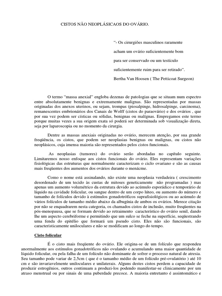 pedculo, levando ao abdmen agudo. Nesta eventualidade estar indicada a interveno cirrgica. Entretanto inmeras mulheres so levadas desnecessariamente cirurgia e submetidas a remoo do ovrio. Nos Estados Unidos, o ndice anual de internaes hospitalares por cistos funcionais dos ovrios foi estimado em torno de 500 casos por 100.000 mulheres / ano, o que assustador. No brasil certamente muito maior, basta consultar qualquer servio de anatomia patolgica e verificar a quantidade de ovrios normais que so encaminhados com um simples cisto folicular ou cisto de corpo lteo hemorrgico ( fig. 1 ). Poucas situaes clinicas seguem um raciocnio to matemtico quanto os cistos funcionais do ovrio. Excludos os ovrios policsticos cuja causa a anovulao crnica e a conduta ser orientada pelo objetivo especfico da paciente, podemos afirmar que todos eles regridem no prazo de 4 a 8 semanas ou excepcionalmente um pouco mais tarde. Se persistir, certamente no ser um cisto funcional. A orientao bsica a seguinte: - Cistos ovarianos uniloculares, unilaterais, medindo at 8 cm de dimetro, em pacientes em idade reprodutiva (no mencme) desaparecem em cerca de 70 % dos casos. Portanto, ao depararmos com um cisto de ovrio com estas caractersticas, deveremos aguardar 2 meses e reavaliar. Se persistir do mesmo tamanho ou aumentado, a cirurgia estar indicada, porque seguramente no se trata de um cisto funcional. . Obviamente este raciocnio no se aplica s pacientes na infncia e ps-menopausa. Um trabalho clssico de Spanos [1] ratifica e fortalece esta conduta. Ele observou 286 pacientes entre 16 e 48 anos de idade com cistos anexiais com as caractersticas acima mencionadas, durante 6 semanas e sob o uso de anticoncepcionais orais. Das 286, apenas 81 (29%) permaneceram com a leso. Em 205 pacientes (71%) a leso desapareceu espontaneamente. As 81 pacientes que permaneceram com as massas anexiais foram submetidas laparotomia sendo constatado nenhum cisto funcional, 28 cistos endometriticos, 4 cistos do paraovrio e 3 hidrosalpinges. Os 46 casos restantes eram neoplasias assim distribudas: 9 cistos dermoides,32 tumores epiteliais benignos, 4 tumores epiteliais malignos e 1 disgerminoma. Lembrando a frase de Bertha Van Hoosen que abre este captulo, nossa obrigao conhecer muito bem a clnica e a histria natural dos cistos no neoplasicos, para que no faamos da nossa arte e habilidade cirrgica um instrumento que trar mais malefcios do que benefcios para nossas clientes.