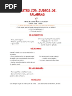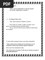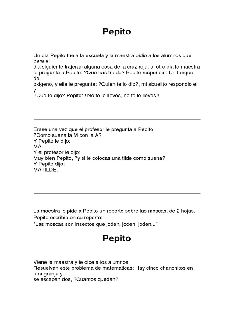 Juanito entra a la cocina y empieza decir a la empleada: !Abuelita abuelita! La mama de Juanito le dice: ?Por que llamas a la sirvienta "abuelita". Juanito le contesta: !Porque mi papa la llama, mamacita! Le dice la mama a Pepito: Pepito, ?por que le pegaste a tu hermana con la silla? !Porque el sofa estaba muy pesado!