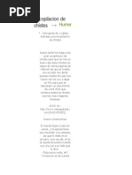 Un vaquero encuentra un indio acostado a la orilla del camino con la oreja pegada a tierra. Curioso por esta costumbre india le pregunta que pasa. El indio le contesta; carreta grande, cuatro ruedas, cuatro caballos, carreta llevar hombre blanco, rifle en brazos, al lado hombre blanco, mujer bonita, pelo largo, mujer llevar nino recien nacido en brazos. El vaquero sorprendido le comenta: !Caramba!, yo habia escuchado de la habilidad de los indios para detectar si vienen caballos o carretas con solo pegar el oido a tierra pero usted me ha sorprendido, ?Como es que puede dar tantos detalles con solo pegar su oido a tierra? Es que, !Acaba de pasarme por encima!