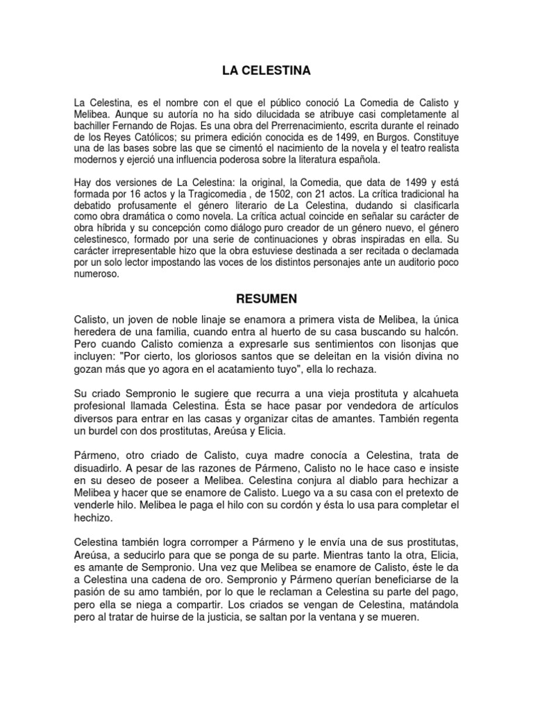 La Celestina, es el nombre con el que el pblico conoci La Comedia de Calisto y Melibea. Aunque su autora no ha sido dilucidada se atribuye casi completamente al bachiller Fernando de Rojas. Es una obra del Prerrenacimiento, escrita durante el reinado de los Reyes Catlicos; su primera edicin conocida es de 1499, en Burgos. Constituye una de las bases sobre las que se ciment el nacimiento de la novela y el teatro realista modernos y ejerci una influencia poderosa sobre la literatura espaola. Hay dos versiones de La Celestina: la original, la Comedia, que data de 1499 y est formada por 16 actos y la Tragicomedia , de 1502, con 21 actos. La crtica tradicional ha debatido profusamente el gnero literario de La Celestina, dudando si clasificarla como obra dramtica o como novela. La crtica actual coincide en sealar su carcter de obra hbrida y su concepcin como dilogo puro creador de un gnero nuevo, el gnero celestinesco, formado por una serie de continuaciones y obras inspiradas en ella. Su carcter irrepresentable hizo que la obra estuviese destinada a ser recitada o declamada por un solo lector impostando las voces de los distintos personajes ante un auditorio poco numeroso.