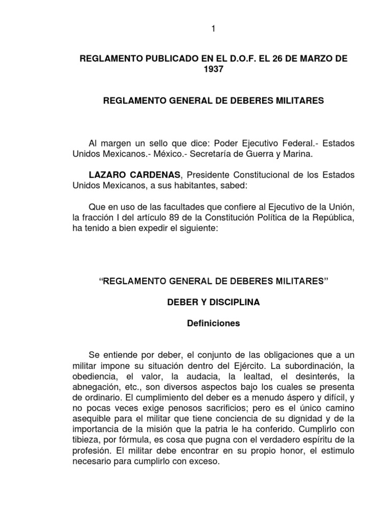 Al margen un sello que dice: Poder Ejecutivo Federal.- Estados Unidos Mexicanos.- Mxico.- Secretara de Guerra y Marina. LAZARO CARDENAS, Presidente Constitucional de los Estados Unidos Mexicanos, a sus habitantes, sabed: Que en uso de las facultades que confiere al Ejecutivo de la Unin, la fraccin I del artculo 89 de la Constitucin Poltica de la Repblica, ha tenido a bien expedir el siguiente:
