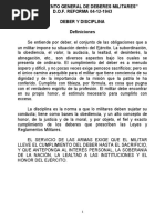 ARTCULO 1. El inters del servicio exige que la disciplina sea firme, pero al mismo tiempo razonada. Todo rigor innecesario, todo castigo no determinado por las leyes o reglamentos que sea susceptible de producir un sentimiento contrario al del cumplimiento del deber, toda palabra, todo acto, todo ademn ofensivos, as como las exigencias que sobrepasen las necesidades o conveniencias del servicio y en general todo lo que constituya una extralimitacin por parte del superior hacia sus subalternos, estn estrictamente prohibidos y sern severamente castigados. ARTCULO 2. El principio vital de la disciplina es el deber de obediencia. Todo militar debe tener presente que tan noble es mandar como obedecer y que mandar mejor quien mejor sepa obedecer.
