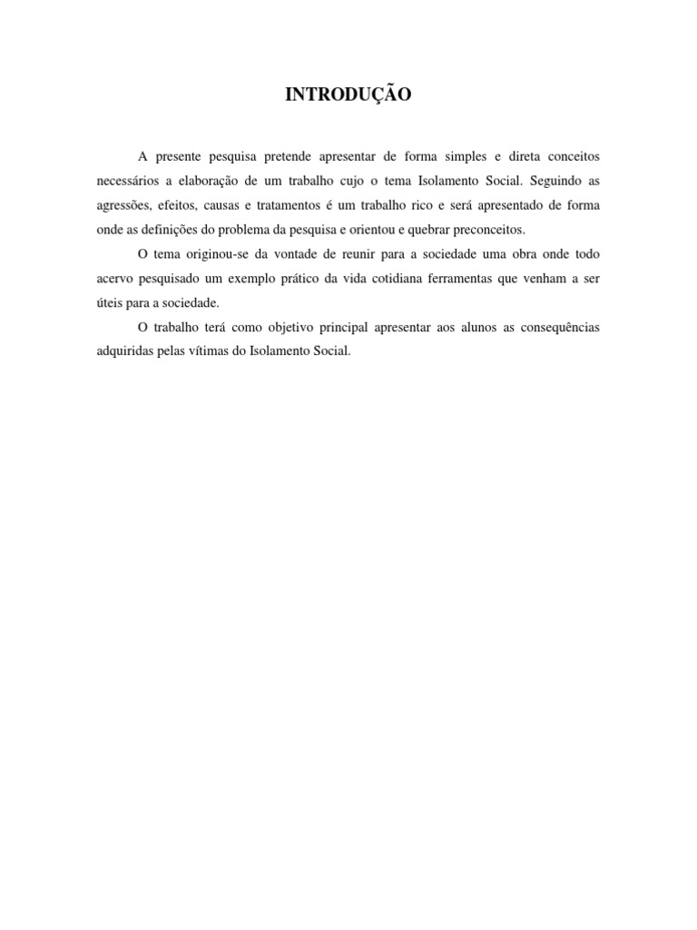 A presente pesquisa pretende apresentar de forma simples e direta conceitos necessrios a elaborao de um trabalho cujo o tema Isolamento Social. Seguindo as agresses, efeitos, causas e tratamentos um trabalho rico e ser apresentado de forma onde as definies do problema da pesquisa e orientou e quebrar preconceitos. O tema originou-se da vontade de reunir para a sociedade uma obra onde todo acervo pesquisado um exemplo prtico da vida cotidiana ferramentas que venham a ser teis para a sociedade. O trabalho ter como objetivo principal apresentar aos alunos as consequncias adquiridas pelas vtimas do Isolamento Social.