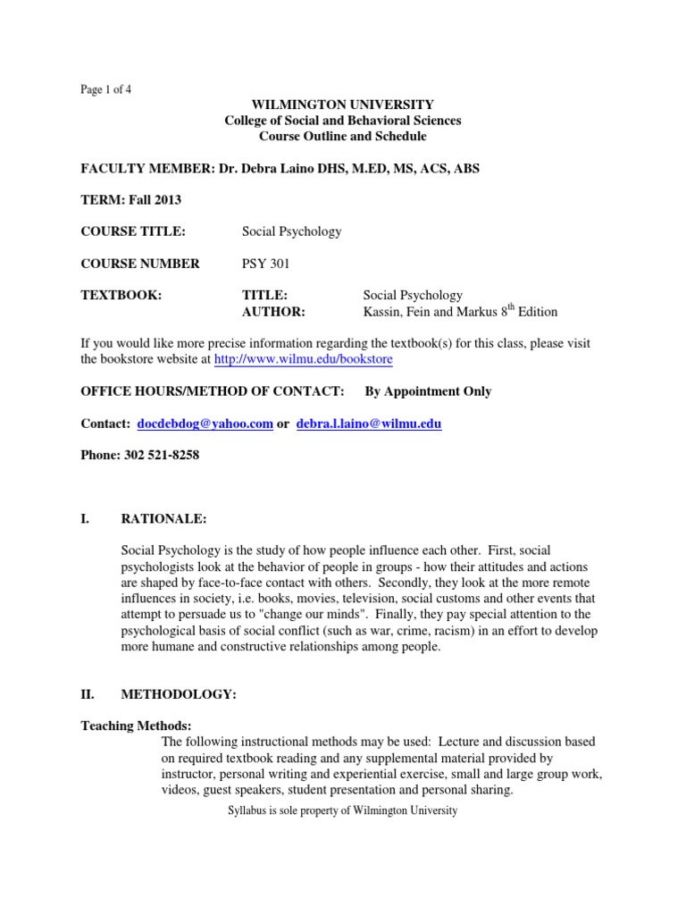 WILMINGTON UNIVERSITY College of Social and Behavioral Sciences Course Outline and Schedule FACULTY MEMBER: Dr. Debra Laino DHS, M.ED, MS, ACS, ABS TERM: Fall 2013 COURSE TITLE: COURSE NUMBER TEXTBOOK: Social Psychology PSY 301 TITLE: AUTHOR: Social Psychology Kassin, Fein and Markus 8th Edition
