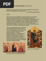 chorro de arena, como chorro de fotones. Piensa en cada fotn como una pequea piedra plana. Al viajar en lnea recta la piedra puede andar bocarriba, bocabajo, de lado ms o menos inclinada. Ese giro es la polarizacin. Cuando un rayo roza el borde agudo de un objeto se rompe siguiendo su camino pero disgregado. Se rompe de forma distinta a como lo hace al reflejarse. Cuando el rayo de luz se rompe en un borde lo hace como cuando el chorro de arena toca el borde de la cerca o el de agua se abre al apretar la boca de la manguera. Cuando el rayo de luz se rompe de esta manera decimos que se difracta. Distingues cada fotn por su color. Un fotn, un color. A la combinacin de fotones que forman la luz llamamos espectro. No todos los colores tienen su fotn. No hay fotones prpura. Si a una luz blanca le quitas los fotones verdes, la ves prpura. Los colores para los que no hay fotones se llaman colores no espectrales. La naturaleza perceptual de la luz es doble. No es lo mismo luz que oscuridad. Tinieblas no es lo mismo que falta de luz. Nunca lo ha sido. La luz irrumpe en la oscuridad. Hay un objeto luz y un objeto oscuridad. Para los antiguos, que no medan, miraban, luz y oscuridad son de naturaleza distinta. Sombra es gradacin contnua entre ambas. La oscuridad reina en el espacio. La luz la rasga y rompe, pero no se aduea de ella. La oscuridad vence a la luz en la figura.