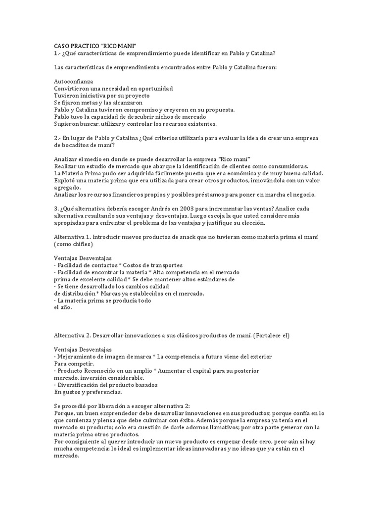 Por otro lado la inversin de la alternativa 2 es de $ 6.500, valor ms alto que la alternativa 1. Es ah donde empieza a jugar un papel muy importante del espritu emprendedor, en tener seguridad y fe de lo que se hace, pues el producto ya era conocido en el mercado, solo se haba pasado o perdido aceptacin en el mercado. 4. Importancia del Espritu Emprendedor Vale la pena tener en cuenta la importancia del Espritu emprendedor; ya que comprende las razones para transmitir y reproducir la actitud de una empresa. Precisamente lo que tuvieron Pablo y Catalina, al momento de iniciar su negocio, confiaron en ellos mismos, en sus capacidades, habilidades y conocimientos tericos. Donde se desprende otro aspecto importante espritu empresarial que es el deseo de ser empresario. Obviamente Pablo y Catalina reunieron requisitos que van de dentro del espritu emprendedor y fue lo que hizo surgir su negocio, esos aspectos son: asumieron un compromiso. Lograron un reconocimiento. Valoraron la lealtad de su ncleo. Mantuvieron un alto nivel de conciencia del ambiente en que vivan usndola para detectar oportunidades de negocio. INNOVACIN EMPRESA EMPLEO ESPIRITU EMPRENDEDOR CASO PRACTICO RICO MANI Fecha: 8 de Junio del 2009 CASO PRCTICO EMPRESA RICO MAN 1. Qu caractersticas de emprendimiento pueden identificar en Pablo y Catalina? Las caractersticas que se pueden identificar en Pablo y Catalina son: Actitud positiva, autoconfianza: Creyeron en su proyecto y lo pusieron en marcha Orientacin al logro: Cumplimiento de metas y objetivos a corto plazo Expectativas de control: Responsabilidad social Orientacin comercial: Poder de negociacin, comunicacin, relaciones interpersonales 2. En el lugar de Pablo y Catalina Qu criterios utilizara para evaluar la idea de crear una empresa de bocaditos de man? Utilizaramos los siguientes criterios: Evaluar nuestras habilidades: Puntos fuertes y dbiles que tenemos para poder empezar un negocio Pon a prueba tu idea de negocio: A travs de procedimientos de seleccin de empresas Beneficios y plan de negocios: Clculo de ingresos previstos y la preparacin de un plan de negocios Calcula el beneficio: Evaluar el aspecto de los beneficios de cada idea, porque de que vales ser muy talentoso (a) sino somos capaces de vender un producto o servicio. Prepare un plan de negocio: Es imprescindible realizar un plan de negocios para evaluar el xito de tu emprendimiento. Estudio de mercado: Para ver si su idea creativa seria aceptada por los consumidores. Publicidad: Mantenerse en el mercado y lograr ventajas competitivas mejores que la competencia. 3. Qu alternativas debera escoger Andrs en el 2003 para incrementar las ventas? Analice cada alternativa resaltando sus ventajas y desventaja, luego escoja la que Ud. considere mas apropiada para enfrentar el problema de las ventas y justifique su eleccin. Alternativa 1: Introducir nuevos productos de snack que no tuvieran como materia prima el man (como chifles)