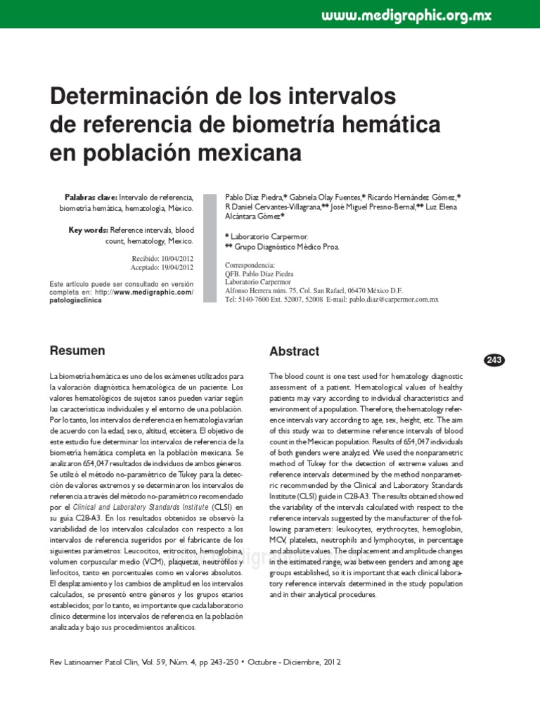 Palabras clave: Intervalo de referencia, biometra hemtica, hematologa, Mxico. Key words: Reference intervals, blood count, hematology, Mexico.