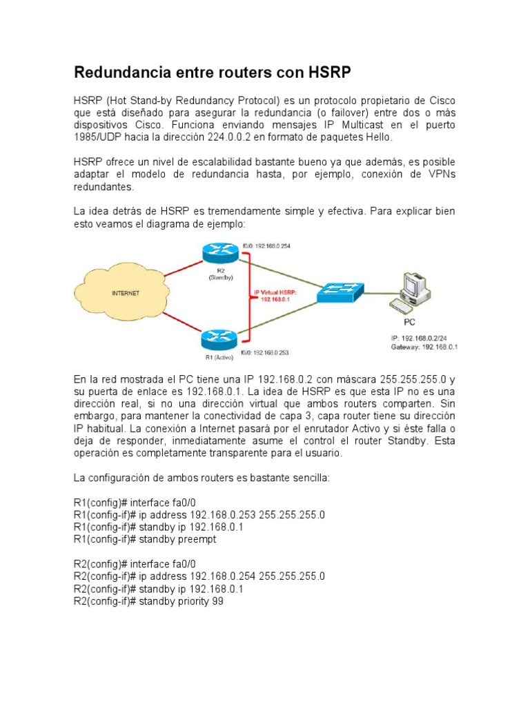 HSRP (Hot Stand-by Redundancy Protocol) es un protocolo propietario de Cisco que est diseado para asegurar la redundancia (o failover) entre dos o ms dispositivos Cisco !unciona enviando mensa"es #P $ulticast en el puerto %&'()*+P ,acia la direcci-n ../ 0 0 . en formato de paquetes Hello HSRP ofrece un nivel de escalabilidad bastante bueno ya que adems1 es posible adaptar el modelo de redundancia ,asta1 por e"emplo1 cone2i-n de 3P4s redundantes 5a idea detrs de HSRP es tremendamente simple y efectiva Para e2plicar bien esto veamos el diagrama de e"emplo6