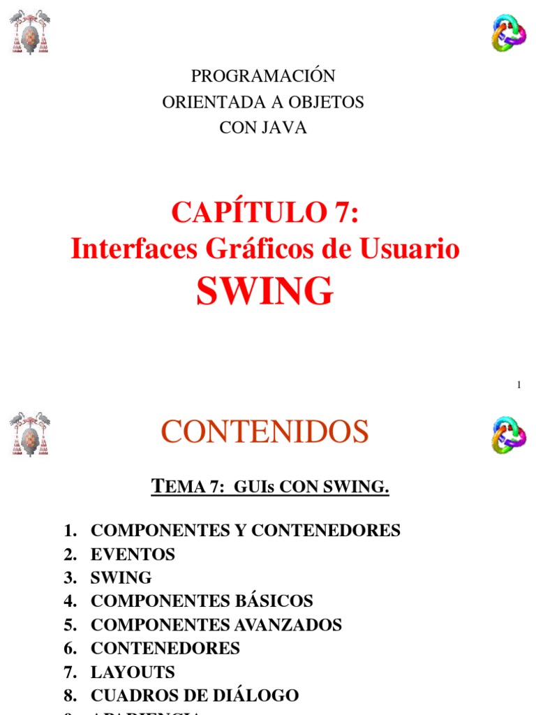 1. COMPONENTES Y CONTENEDORES 2. EVENTOS 3. SWING 4. COMPONENTES BSICOS 5. COMPONENTES AVANZADOS 6. CONTENEDORES 7. LAYOUTS 8. CUADROS DE DILOGO 9. APARIENCIA 10. EJEMPLO APLICACIN POO + SWING
