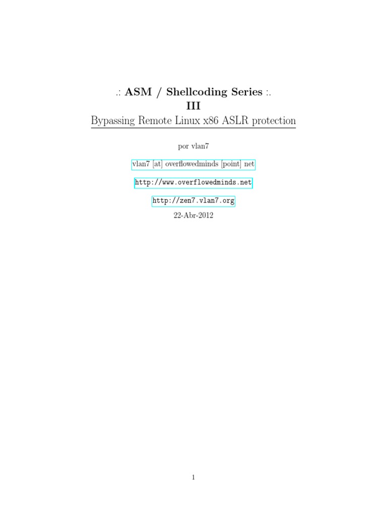 + Segmentation fault en una evasion ASLR/Linux con ret2reg VVAA http://www.wadalbertia.org/foro/viewtopic.php?f=6&t=6167 + Exploiting with linux-gate.so.1 Izik http://www.exploit-db.com/papers/13187/