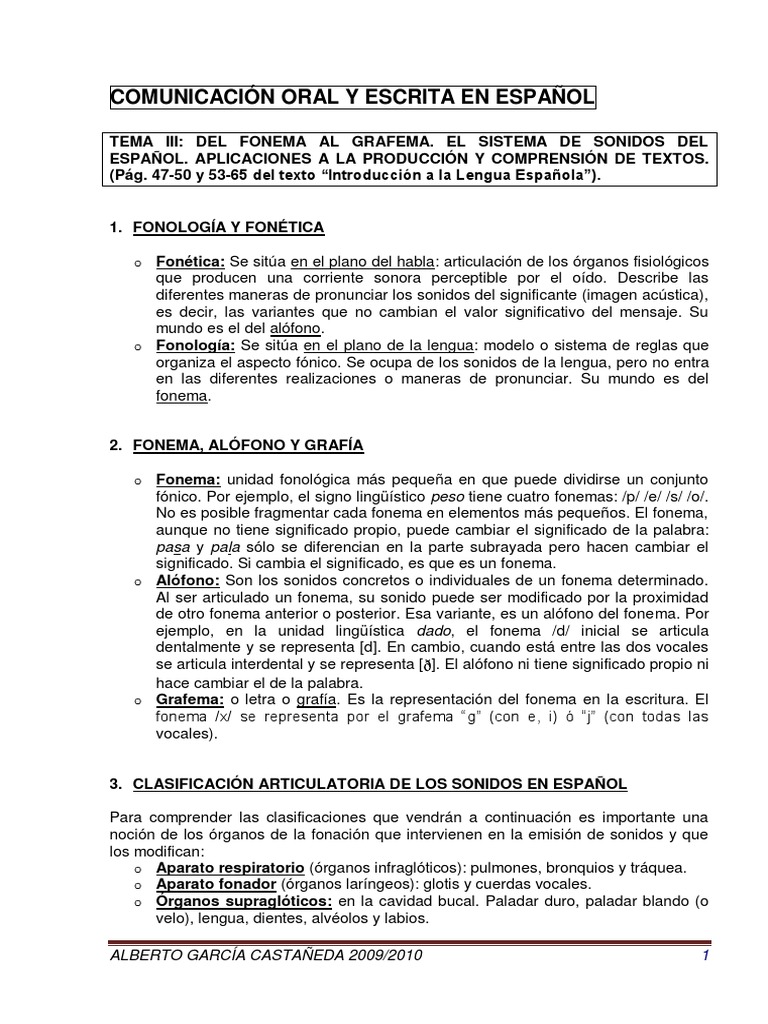 TEMA III: DEL FONEMA AL GRAFEMA. EL SISTEMA DE SONIDOS DEL ESPAOL. APLICACIONES A LA PRODUCCIN Y COMPRENSIN DE TEXTOS. (Pg. 47-50 y 53-65 del texto Introduccin a la Lengua Espaola).
