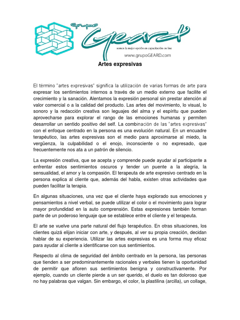 El trmino artes expresivas significa la utilizacin de varias formas de arte para expresar los sentimientos internos a travs de un medio externo que facilite el crecimiento y la sanacin. Alentamos la expresin personal sin prestar atencin al valor comercial o a la calidad del producto. Las artes del movimiento, lo visual, lo sonoro y la redaccin creativa son leguajes del alma y el espritu que pueden aprovecharse para explorar el rango de las emociones humanas y permiten desarrollar un sentido positivo del self. La comb inacin de las artes expresivas con el enfoque centrado en la persona es una evolucin natural. En un encuadre teraputico, las artes expresivas son el medio para aproximarse al miedo, la vergenza, la culpabilidad o el enojo, inconsciente o no expresado, que frecuentemente nos ata a un patrn de silencio. La expresin creativa, que se acepta y comprende puede ayudar al participante a enfrentar estos sentimientos oscuros y tender un puente a la alegra, la sensualidad, el amor y la compasin. El terapeuta de arte expresivo centrado en la persona explica al cliente que, adems del habla, existen otras actividades que pueden facilitar la terapia. En algunas situaciones, una vez que el cliente haya explorado sus emociones y pensamientos a nivel verbal, se puede utilizar el color o el movimiento para lograr mayor profundidad en la auto comprensin. Estas expresiones tambin forman parte de un poderoso lenguaje que se establece entre el cliente y el terapeuta. El arte se vuelve una parte natural del flujo teraputico. En otras situaciones, los clientes quiz elijan iniciar con arte, y despus, al ver su propia creacin, decidan hablar de su experiencia. Utilizar las artes expresivas es una forma muy eficaz para ayudar al cliente a identificarse con sus sentimientos. Respecto al clima de seguridad del mbito centrado en la persona, las personas que tienden a ser predominantemente racionales y verbales tienen la oportunidad de permitir que afloren sus sentimientos benigna y constructivamente. Por ejemplo, cuando un cliente pierde a un ser querido, el duelo es tan doloroso que no hay palabras que valgan. Sin embargo, el color, la plastilina (arcilla), un collage,