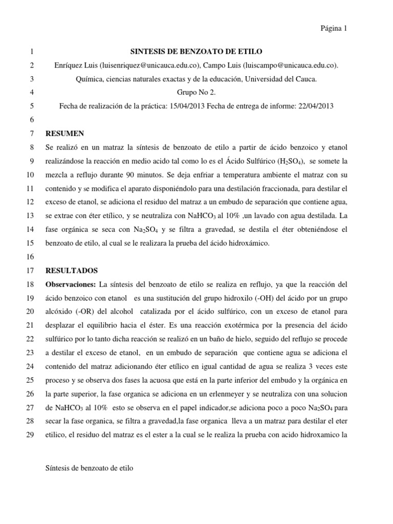 etanol es una sustitucin del grupo hidroxilo (-OH) del cido por un grupo alcxido (-OR) del alcohol catalizada por el cido sulfrico, con un exceso de etanol para desplazar el equilibrio hacia el ster. Es una reaccin exotrmica por la presencia del cido sulfrico por lo tanto dicha reaccin se realiz en un bao de hielo, seguido del reflujo se procede a destilar el exceso de etanol, en un embudo de separacin que contiene agua se adiciona el contenido del matraz adicionando ter etlico en igual cantidad de agua se realiza 3 veces este proceso y se observa dos fases la acuosa que est en la parte inferior del embudo y la orgnica en la parte superior, la fase organica se adiciona en un erlenmeyer y se neutraliza con una solucion de NaHCO3 al 10% esto se observa en el papel indicador,se adiciona poco a poco Na2SO4 para secar la fase organica, se filtra a gravedad,la fase organica lleva a un matraz para destilar el eter etilico, el residuo del matraz es el ester a la cual se le realiza la prueba con acido hidroxamico la RESUMEN Se realiz en un matraz la sntesis de benzoato de etilo a partir de cido benzoico y etanol realizndose la reaccin en medio acido tal como lo es el cido Sulfrico (H2SO4), se somete la mezcla a reflujo durante 90 minutos. Se deja enfriar a temperatura ambiente el matraz con su contenido y se modifica el aparato disponindolo para una destilacin fraccionada, para destilar el exceso de etanol, se adiciona el residuo del matraz a un embudo de separacin que contiene agua, se extrae con ter etlico, y se neutraliza con NaHCO3 al 10% ,un lavado con agua destilada. La fase orgnica se seca con Na2SO4 y se filtra a gravedad, se destila el ter obtenindose el benzoato de etilo, al cual se le realizara la prueba del cido hidroxmico. SINTESIS DE BENZOATO DE ETILO Enrquez Luis (luisenriquez@[Link]), Campo Luis (luiscampo@[Link]). Qumica, ciencias naturales exactas y de la educacin, Universidad del Cauca. Grupo No 2. Fecha de realizacin de la prctica: 15/04/2013 Fecha de entrega de informe: 22/04/2013